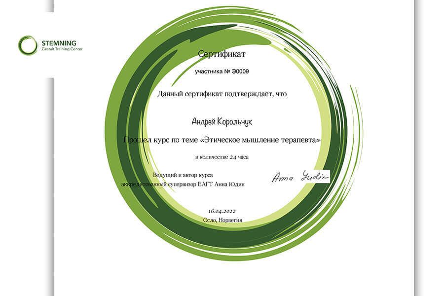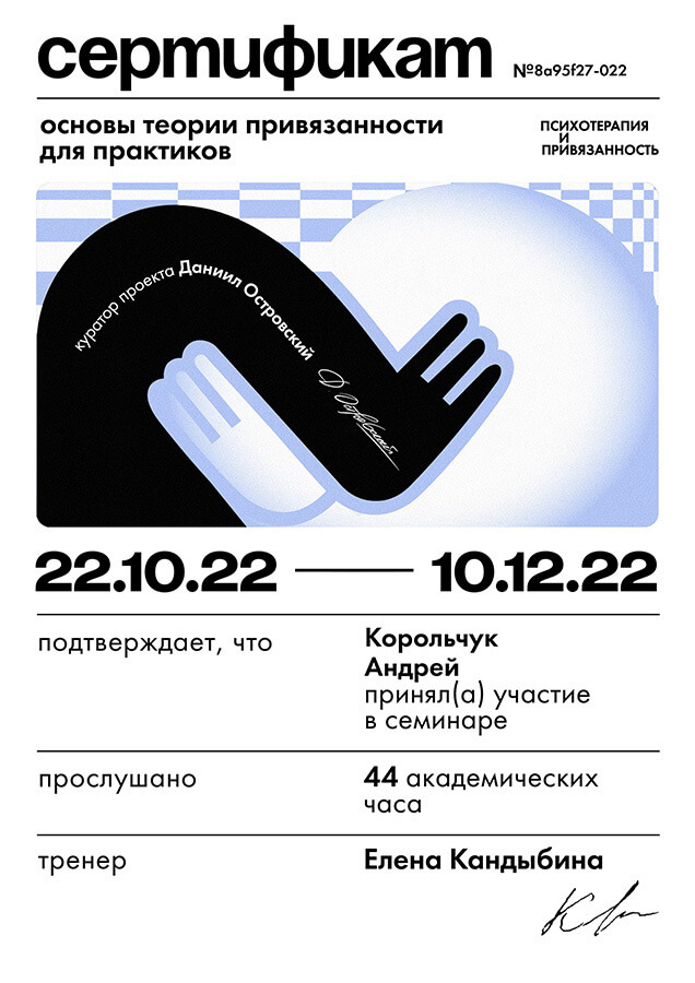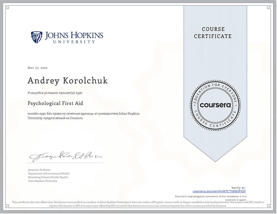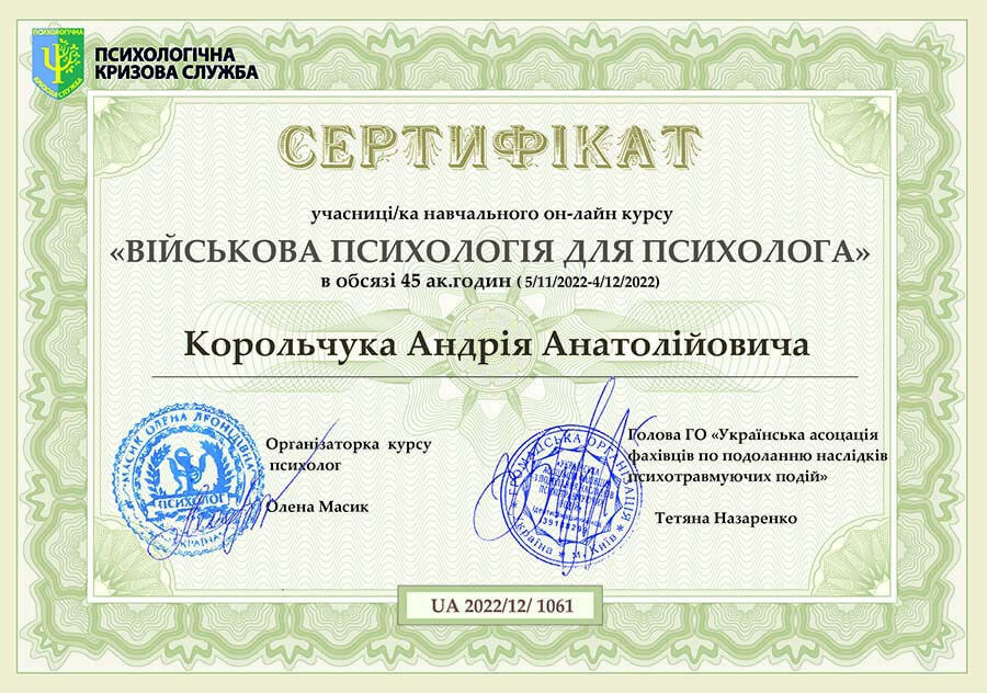 Успішно завершив програму курсу підвищення кваліфікації для психологів «Професійна психодіагностика» 200 годин на базі ОНУ ім. І.І. Мечникова під керівництвом професора, доктора психологічних наук Н.В.Родіной.