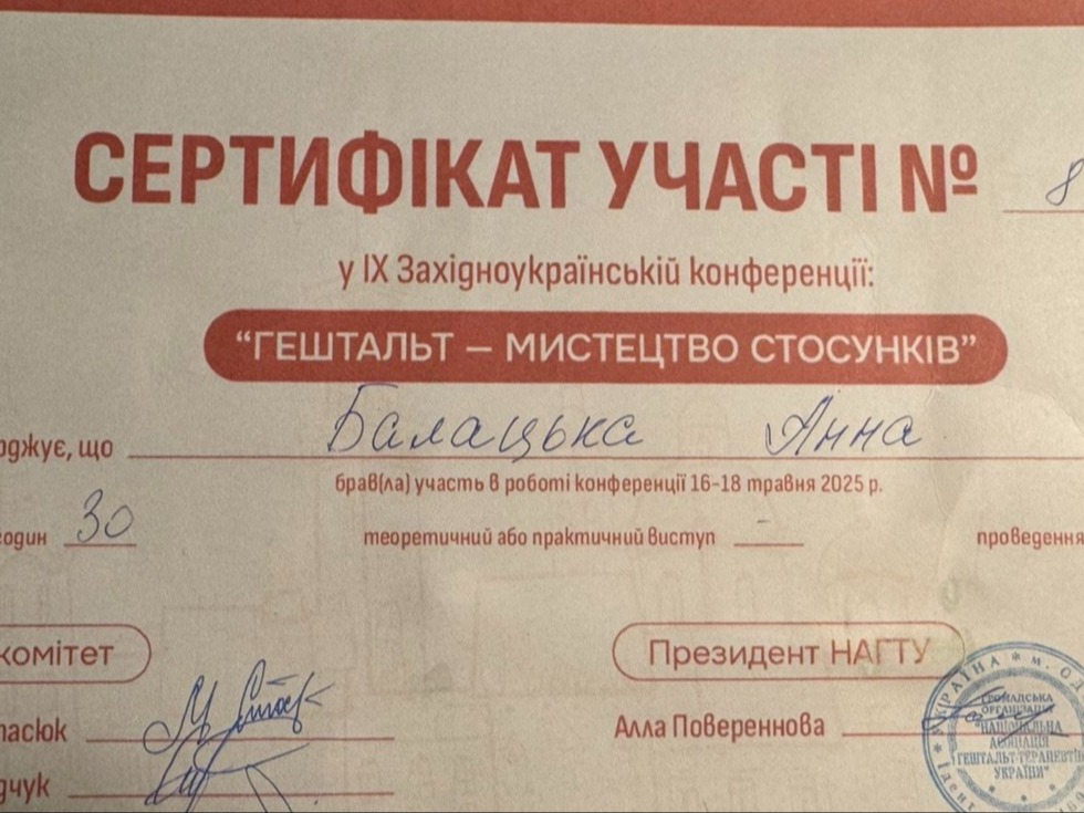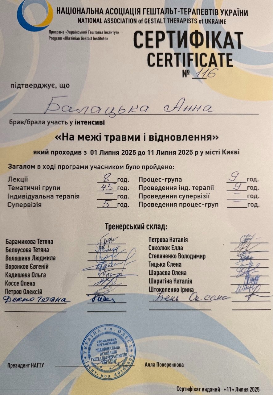 Cертифікована гештальт-терапевтка у спільноті НАГТУ (Національна Асоціація гештальт-терапевтів України).