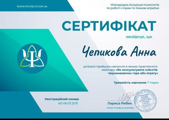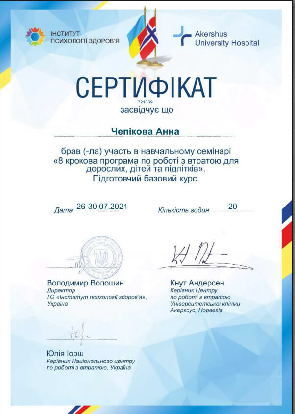 Я психотерапевт із стажем 15 років. Закінчила 2 академічні ВНЗ, отримала спеціалізацію гештальт терапевта.