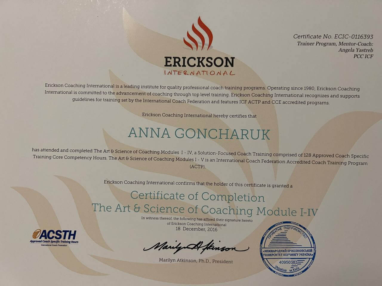 2. Міжнародний Еріксонівський університет коучингу, WPG Трансформаційний коучинг. Міжнародний сертифікат "Erickson Professional Coach".