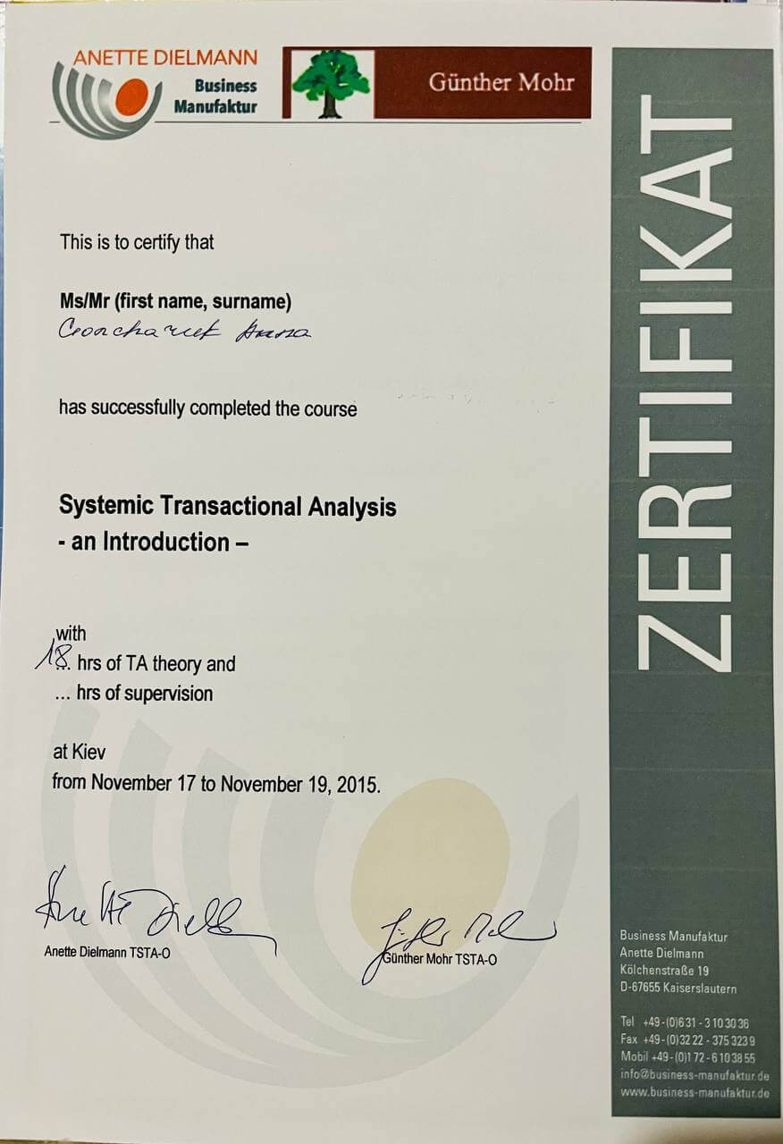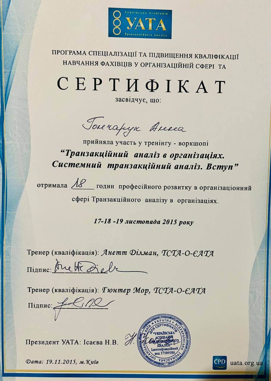 1. Всеукраїнське товариство психологів, які практикують гештальт-підхід, EAGT, Гештальт-терапевт, супервізор, викладач гештальт-терапії.