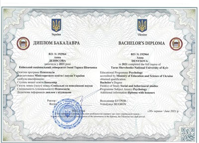 Маю вищу освіту, закінчила Київський Національний Університет імені Тараса Шевченка, спеціальність психологія, бакалавр, рік випуску 2021.