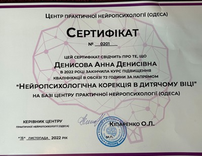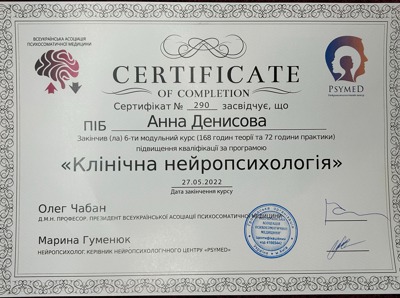 Закінчила курси по напрямку клінічної нейропсихології.