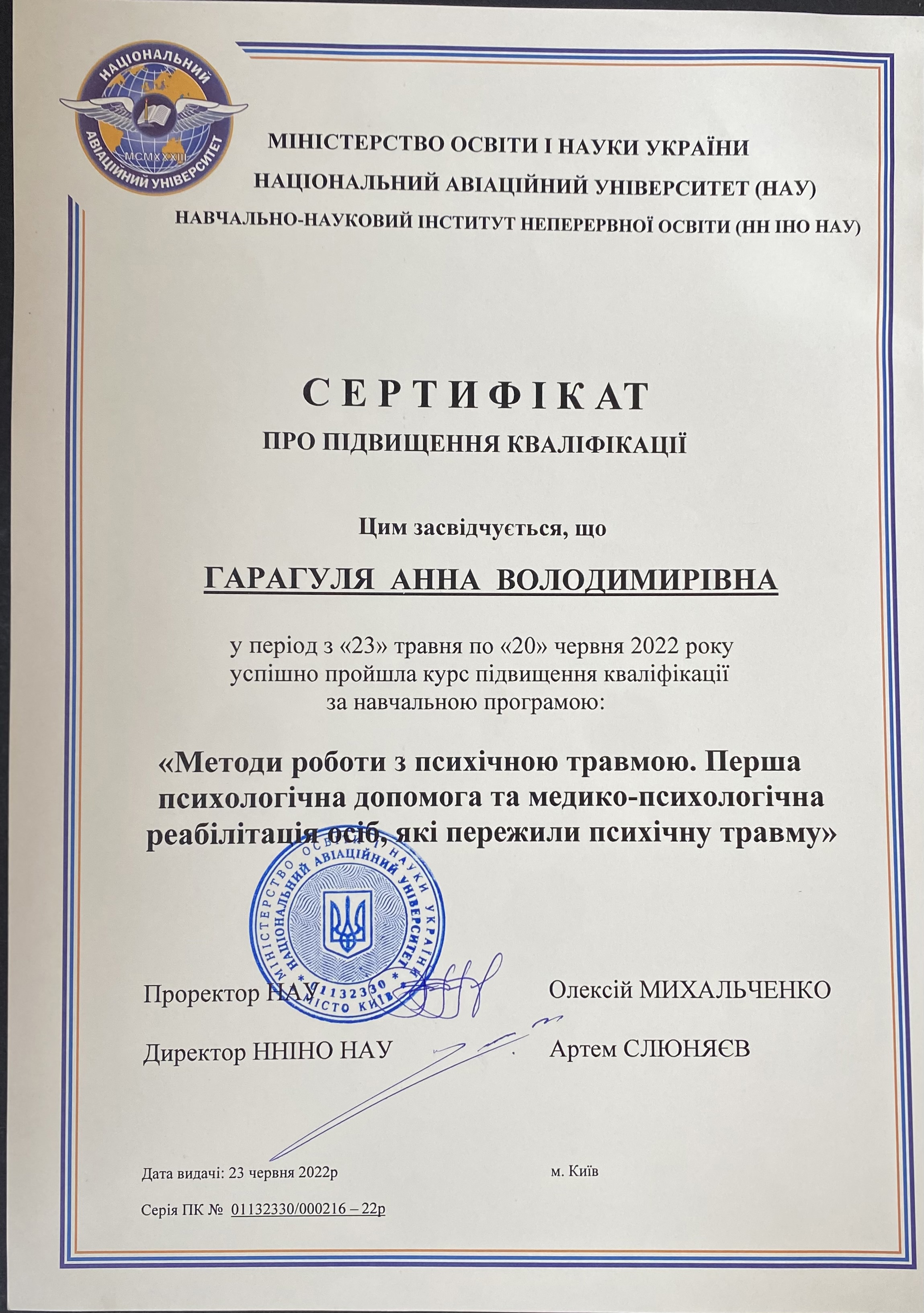 Методи роботи з психічною травмою 1-а психологічна допомога та медику психологічна реабілітація осіб, які пережили психічну травму 64 години національний авіаційний університет міста Київ, 2022рік