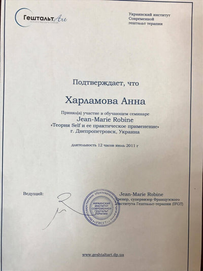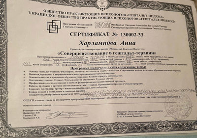 – Московський Гештальт Інститут. Кваліфікація – Гештальт терапевт.