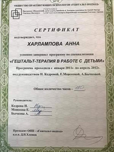 - Спеціалізація «Гештальт-терапія в роботі з дітьми та підлітками» (програма МДІ)
