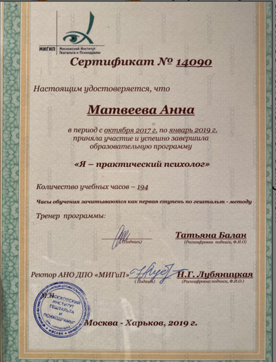Прийшла до психотерапії, щоб знайти себе. Після 10 років у ролі хорошої мами та дбайливої дружини, повірте, це було нелегко. Тепер психологія - моя улюблена професія, я знаю чого хочу і вірю, що особисті зміни змінюють все навколо (і я лишаюсь гарною мамою і дружиною).