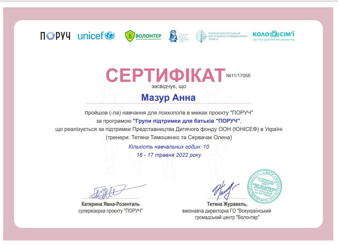 • Тренінг-семінар «Засоби конструктивного подолання стресу та допомоги при психічній травмі. Профілактика професійного вигорання у спеціалістів допомагаючих професій.»(2019р)