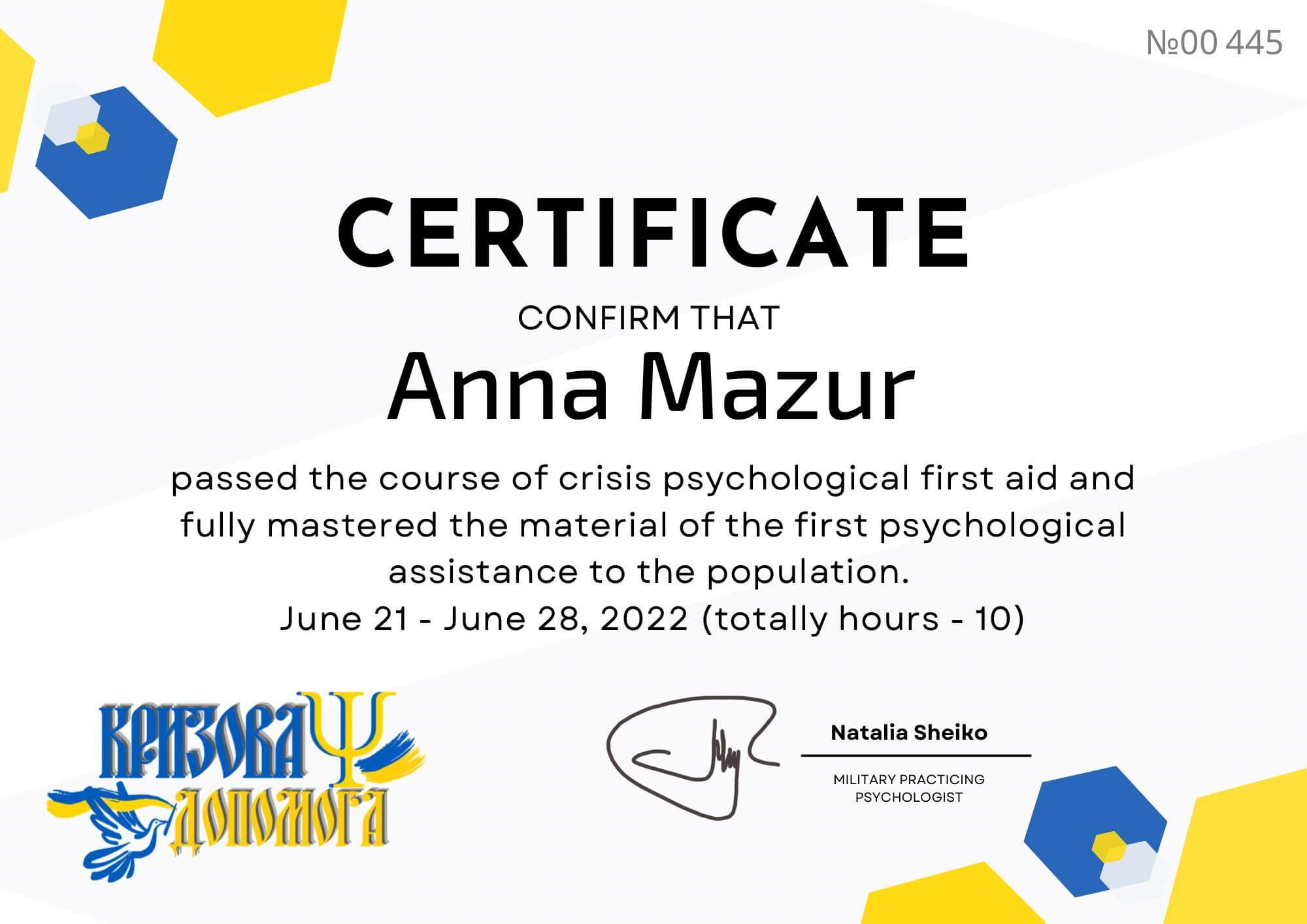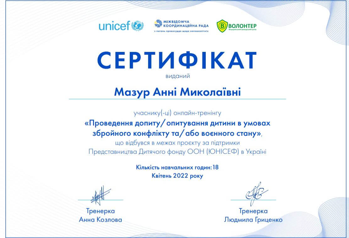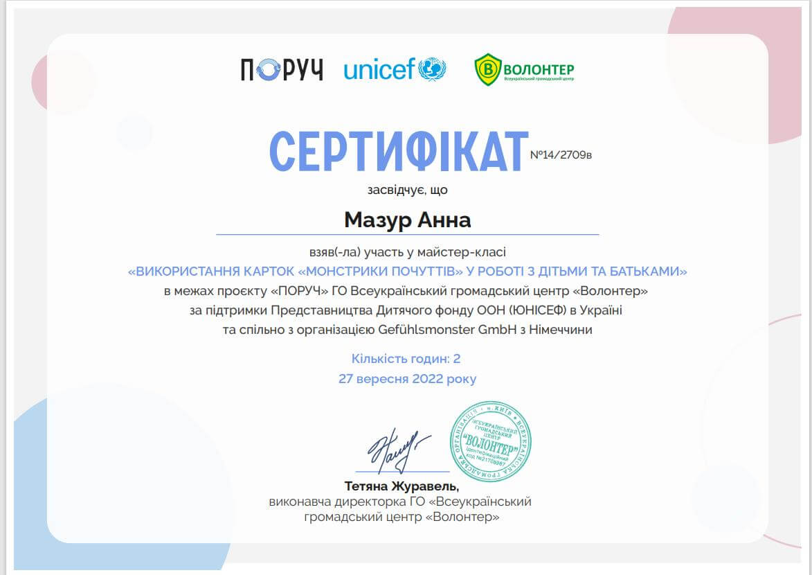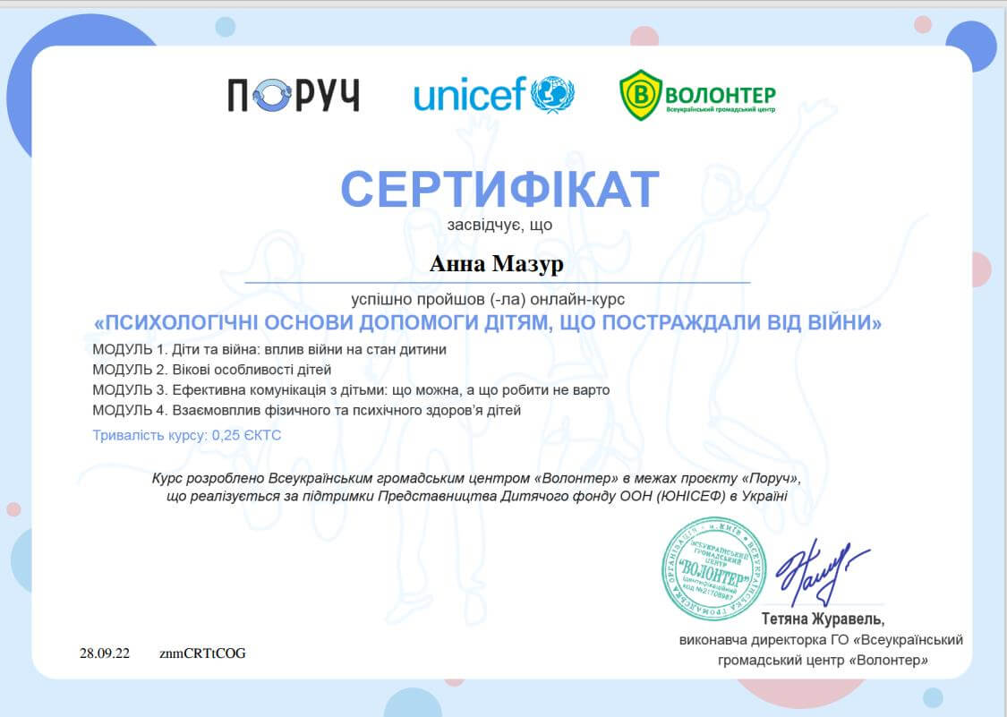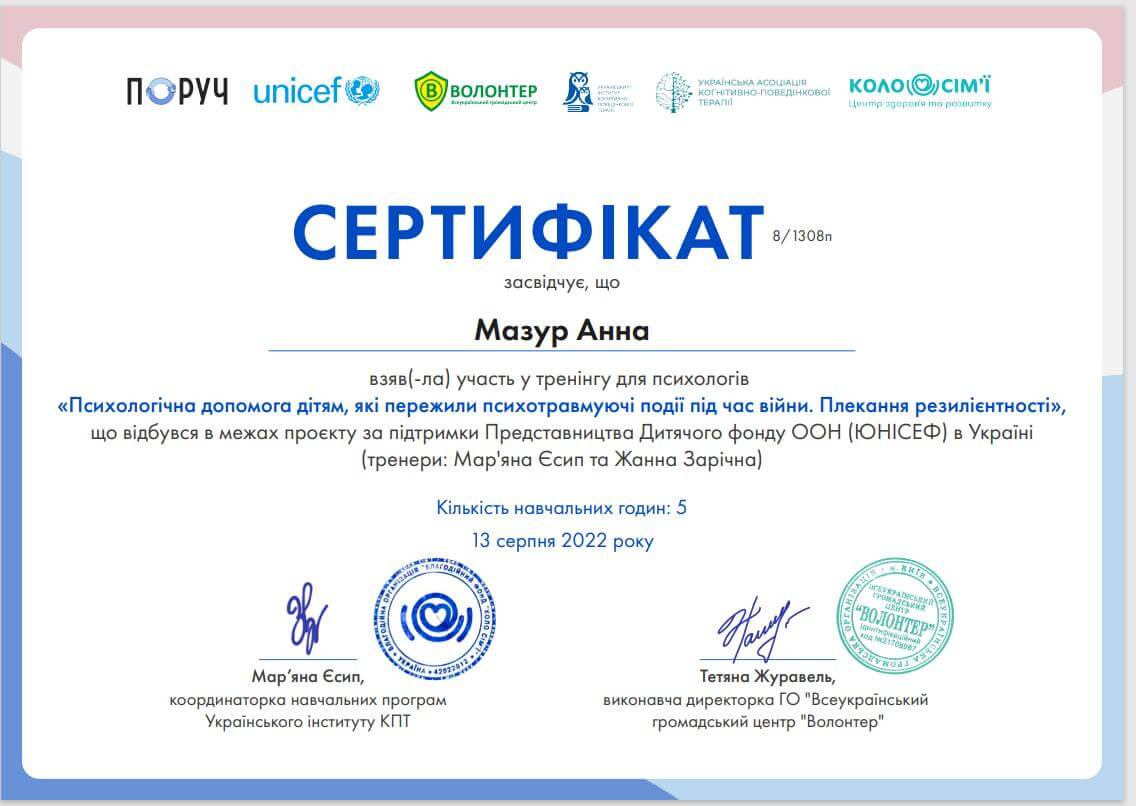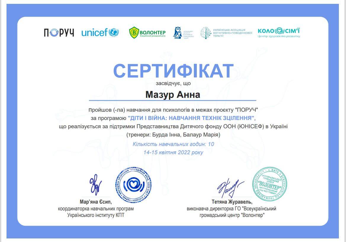 • «Психологічна підтримка дітей у кризових ситуаціях методами арт-терапії» (2016 р.).