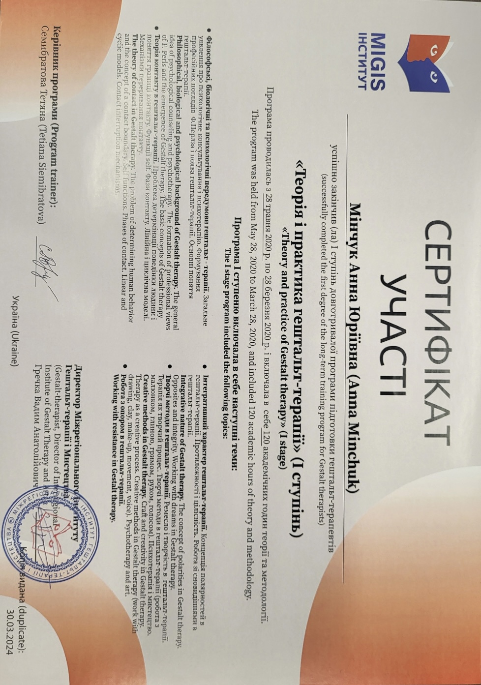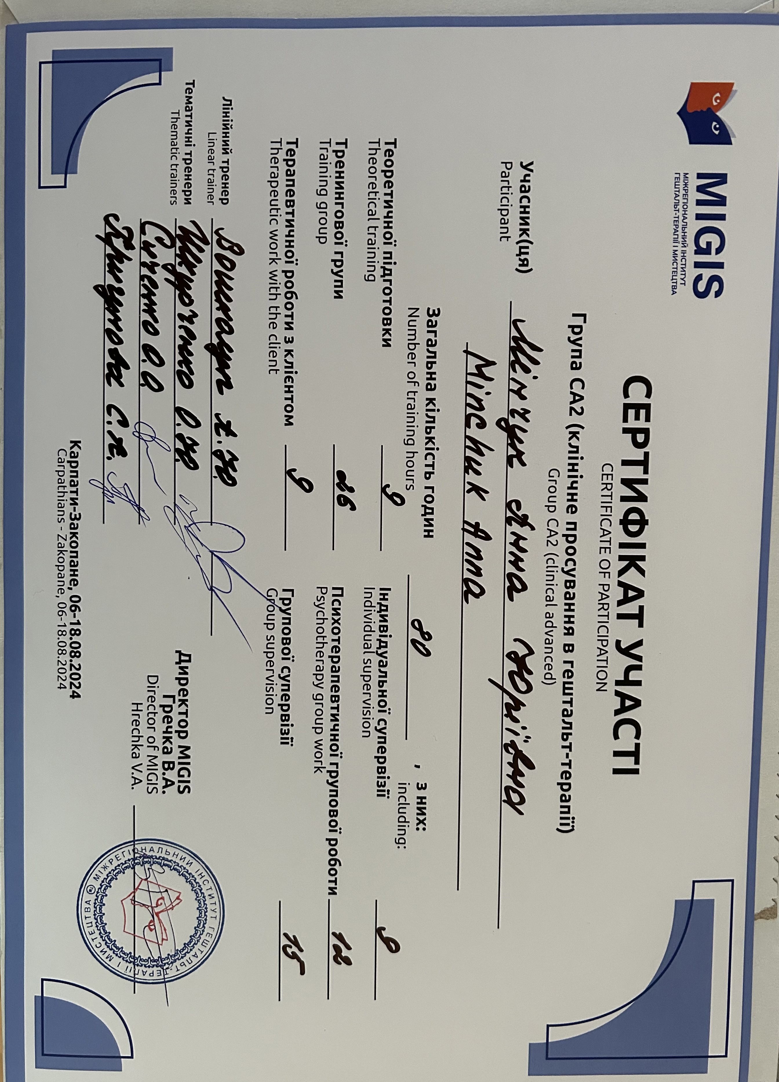 Маю чотири роки досвіду особистої терапії,групової терапії вже 5 років,супервізії.