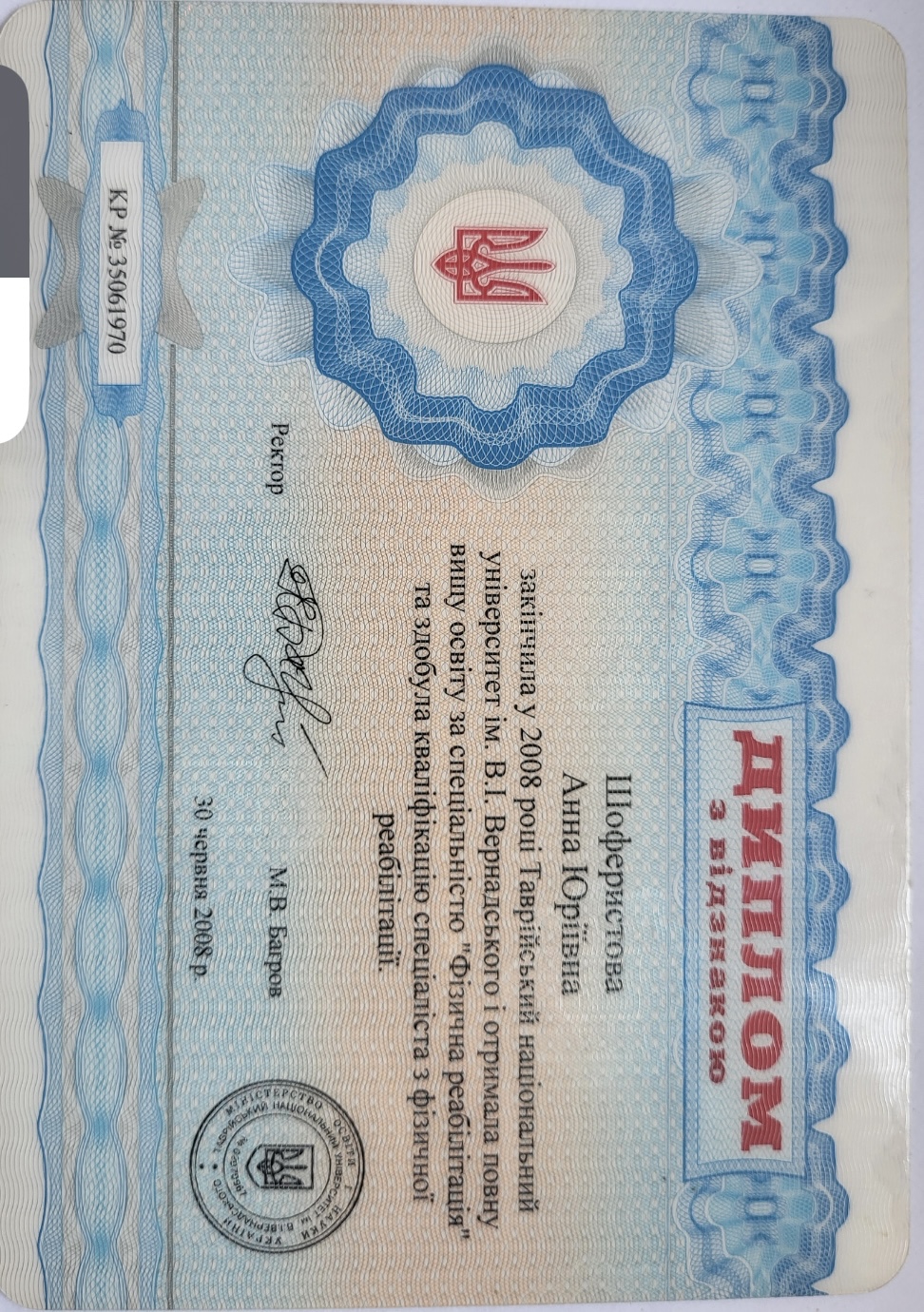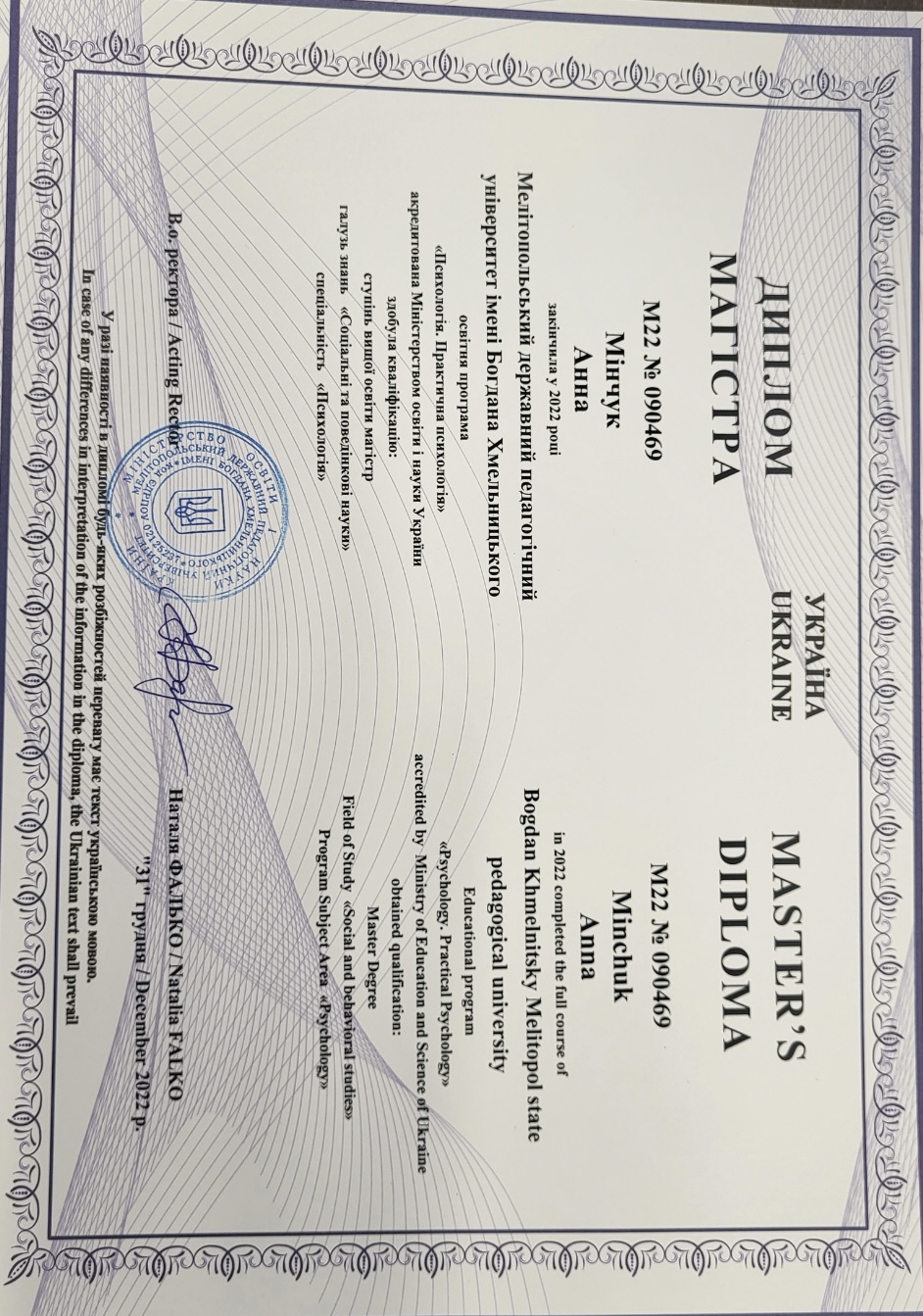 Маю вищу освіту магістра психології ,Мелітопольський державний педагогічний університет імені Богдана Хмельницького.Зараз проходжу навчання на другій сходинцІ на гештальт терапевта в МІГТІМ,залишився рік.В вересні екзамен по спеціалізації дитячі-батьківських відносин,також навчаюсь на спеціалізації залежних відносин.Приймала участь на трьох конференціях в МІГТІМ,двох інтенсивах.