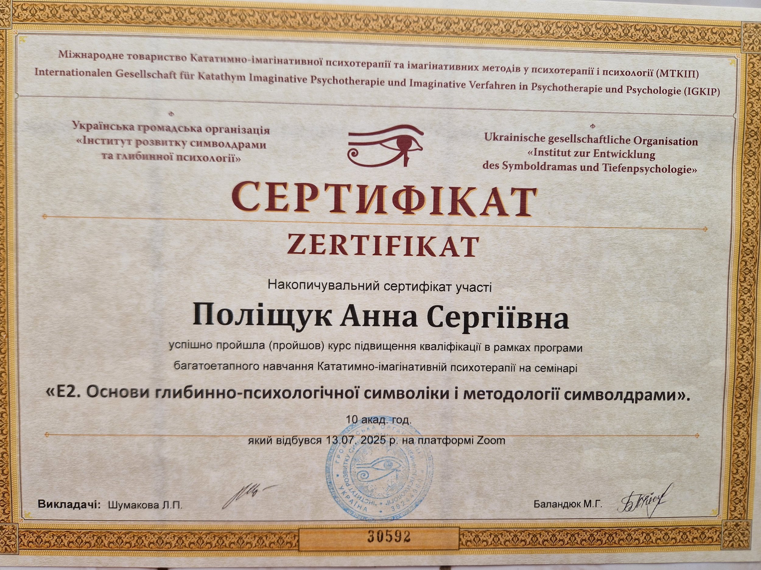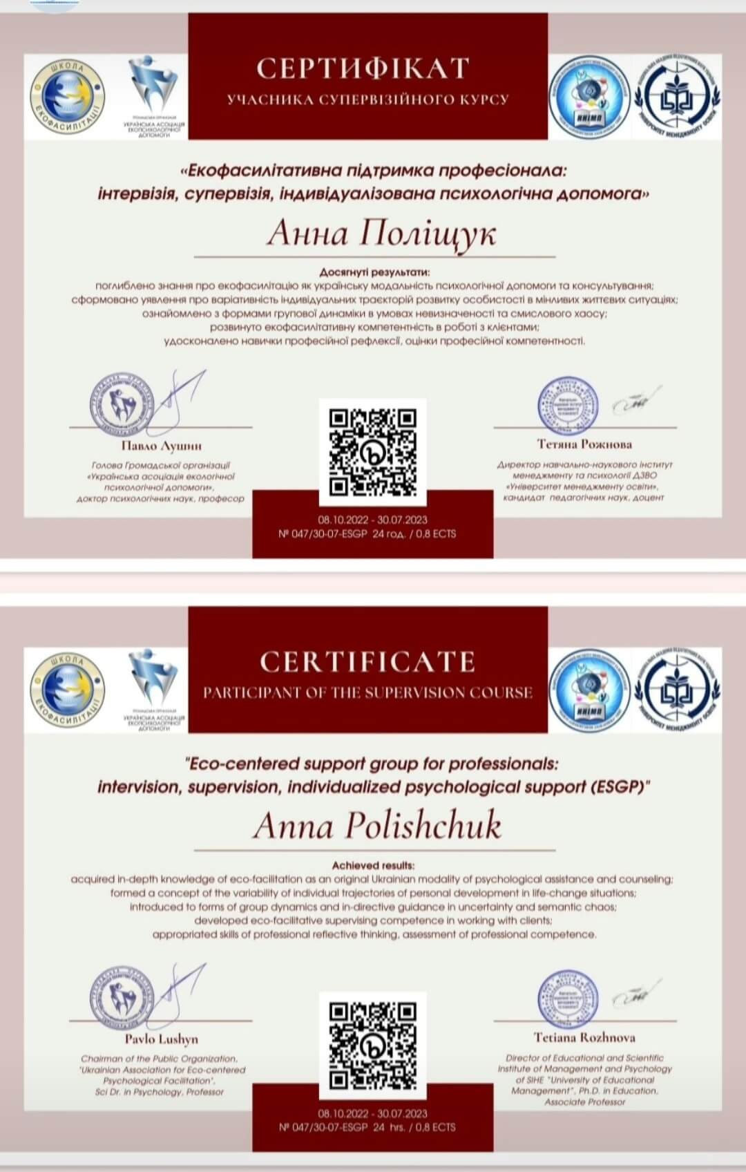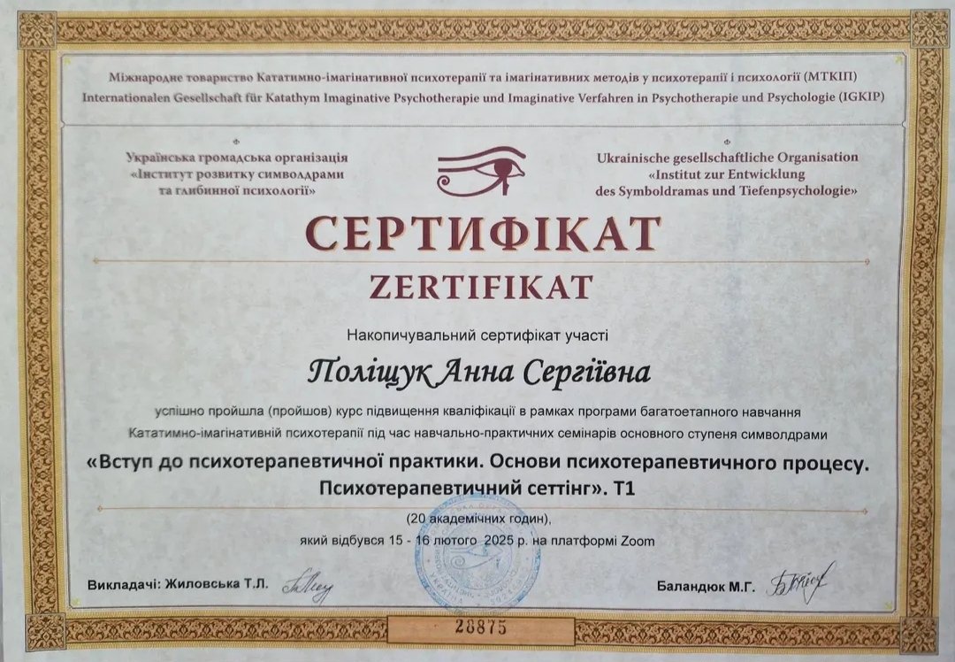 Додатково сертифікація -різні семінари по ЕОТ,символдрамі,груповій,індивідуальній терапіїї, супервізійному супроводі
