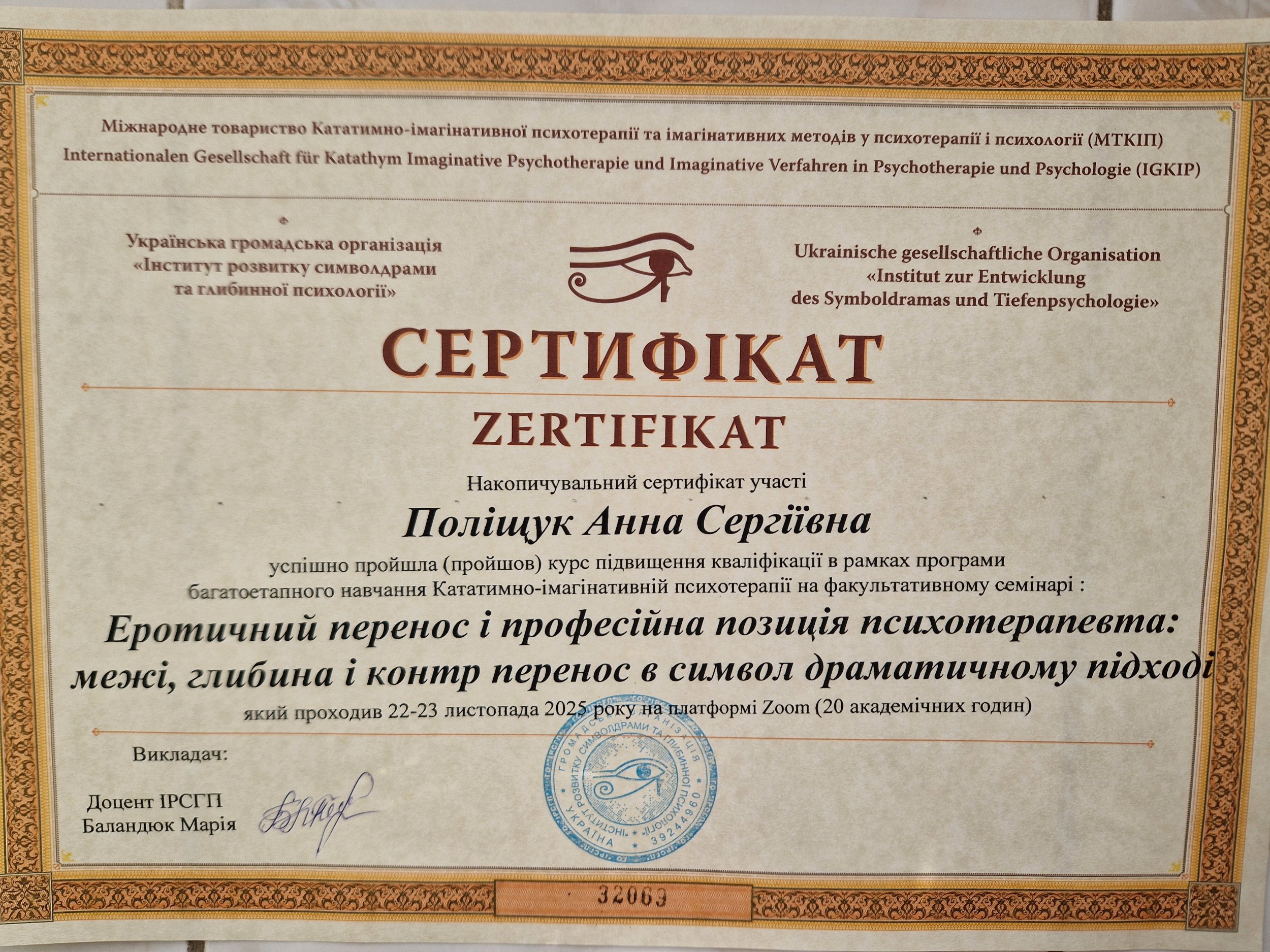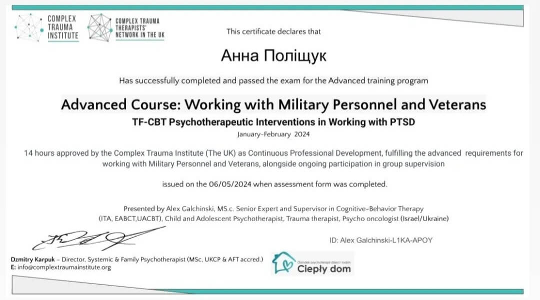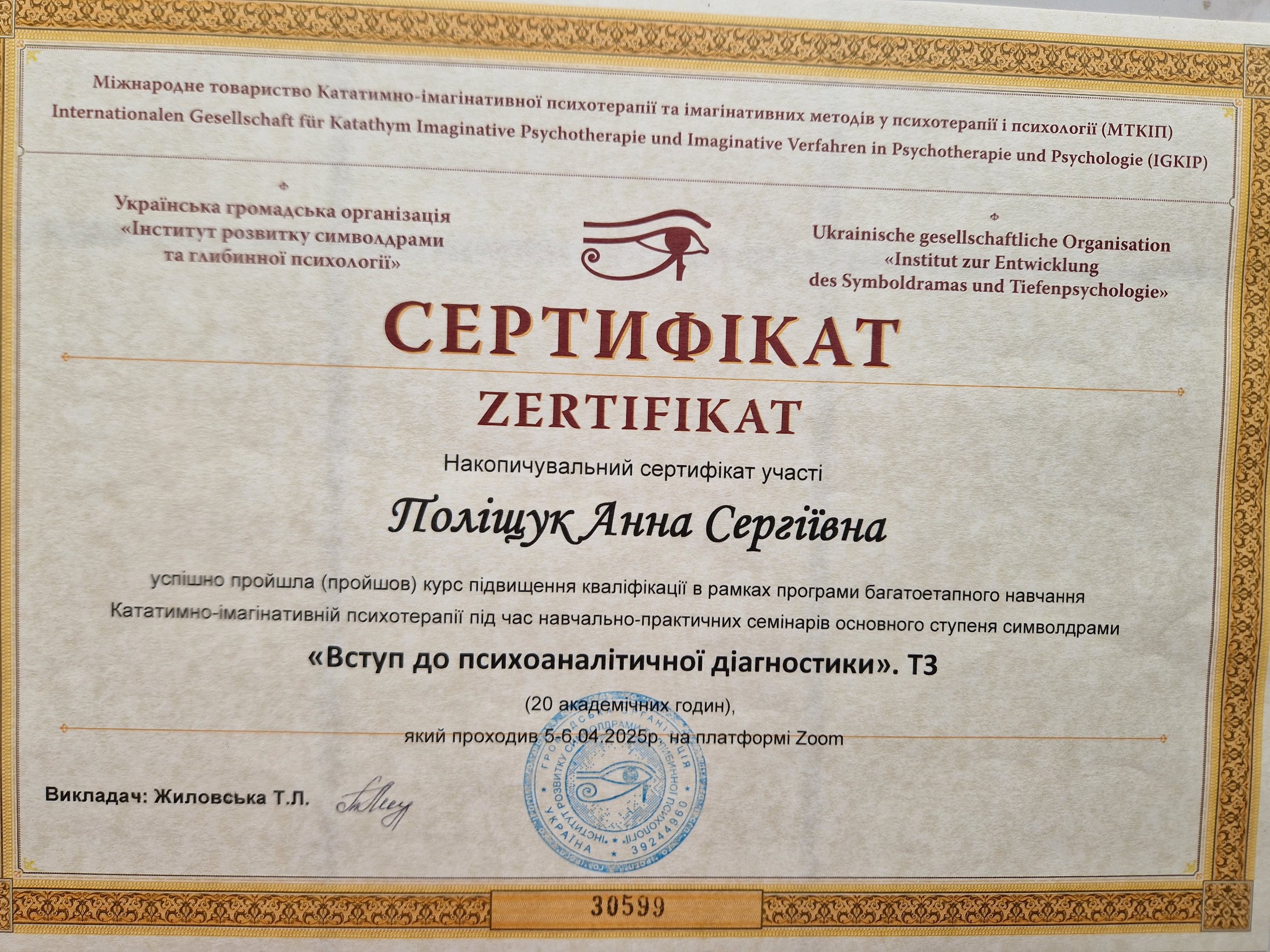 Додатково сертифікація -різні семінари по ЕОТ,символдрамі,груповій,індивідуальній терапіїї, супервізійному супроводі