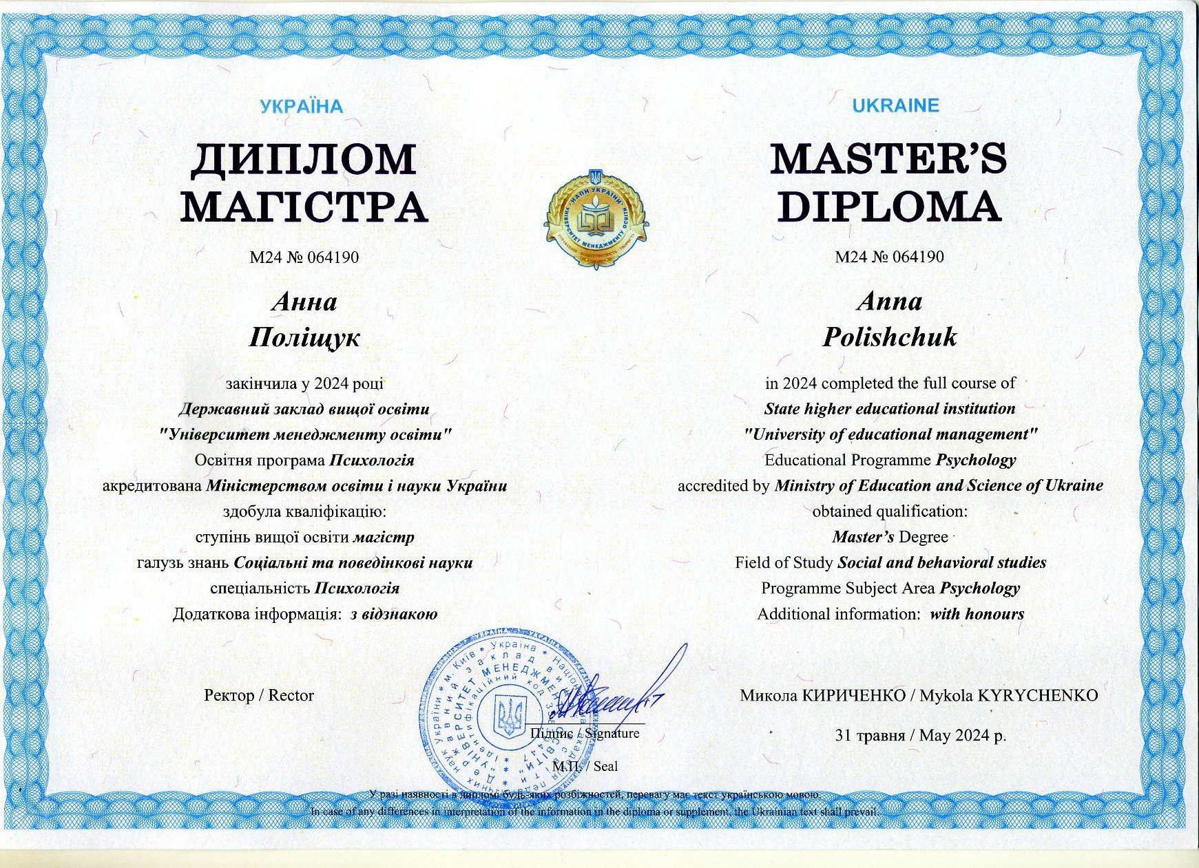 Диплом магістра ДЗВО Університет менеджменту освіти, Психологія, з відзнакою, 2024