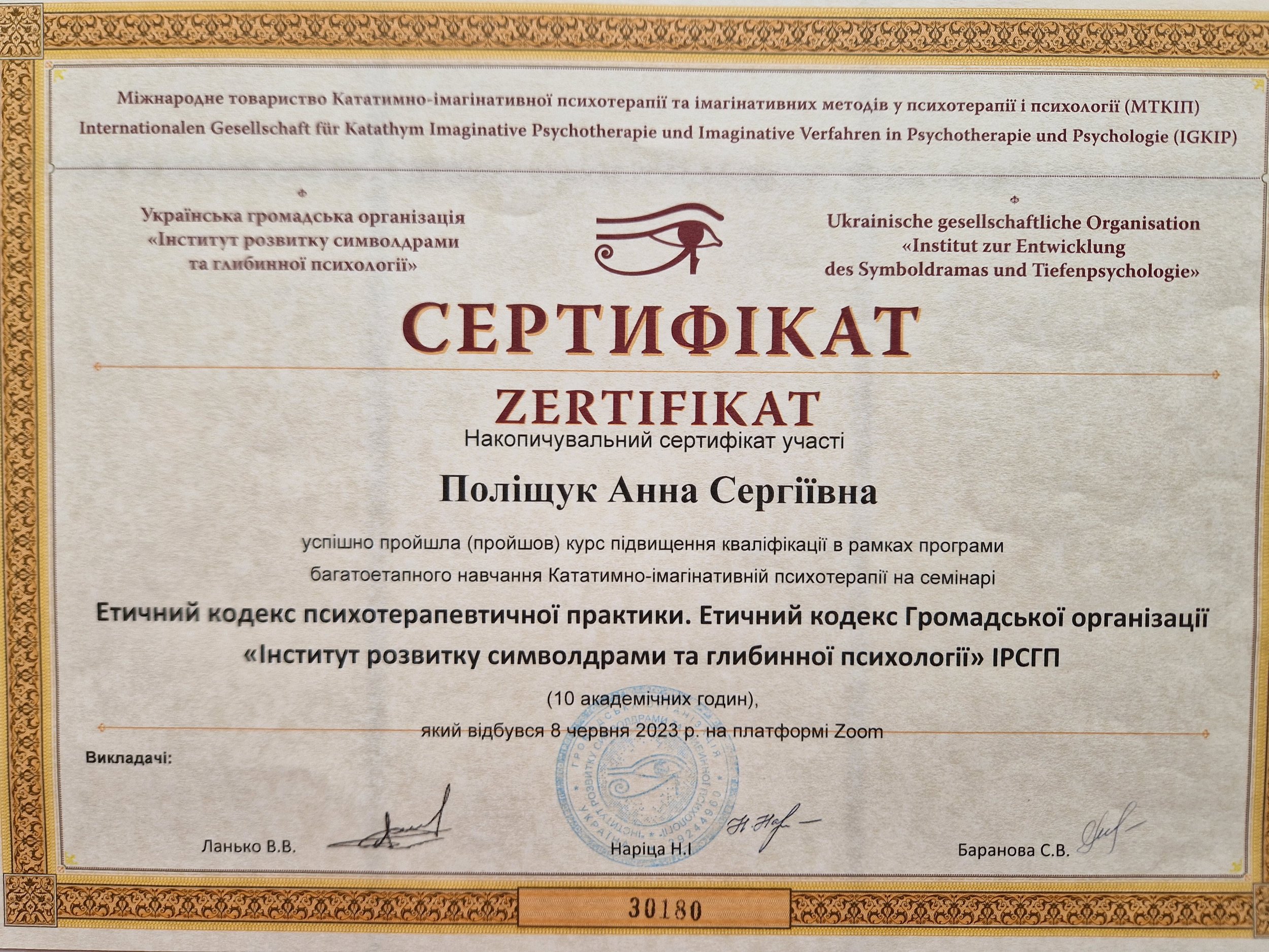 6. Ізмаїльський державний гуманітарний університет ,Тренінговий центр Наталії Сабліної, Міжнародна асоціація психологів та тренерів -експертів, Університет сучасних знань «Основи психологічного консультування, психотерапії та коучинг .З чого почати приватну практику»-січень-березень 2024р.