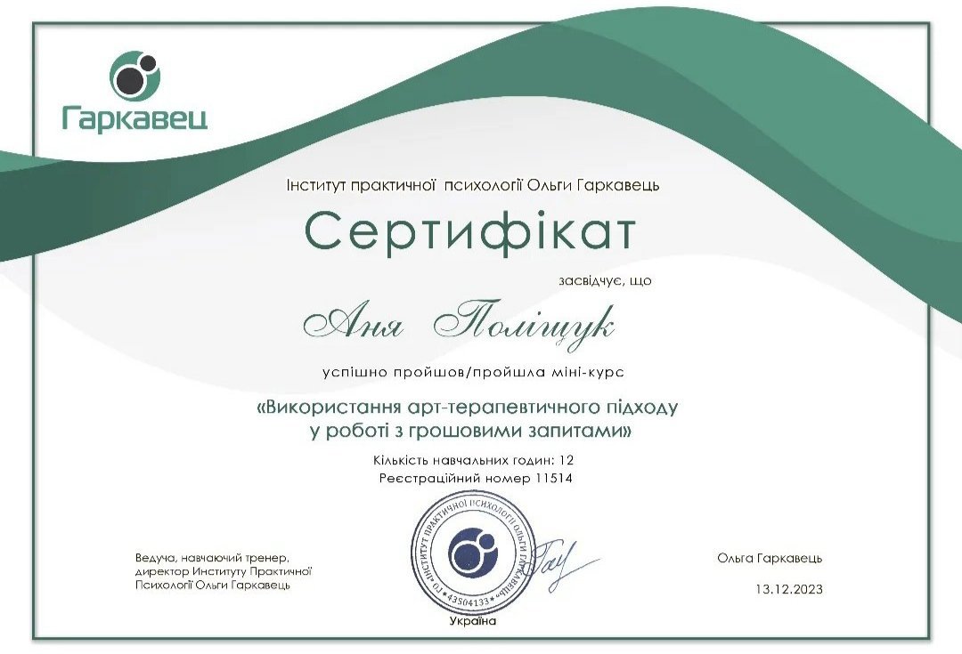 5. Інститут практичної психології Ольги Гаркавець « Використання арт-терапевтичного підходу у роботі з грошовими запитами» -грудень 2023р.