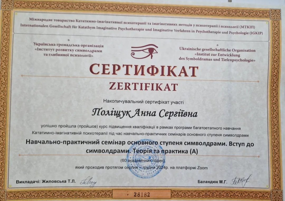 Інститут розвитку символдрами та глибинної психології (ІРСГП) навчаюсь на консультанта-2024-донині: