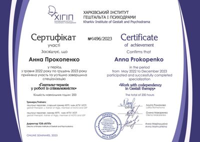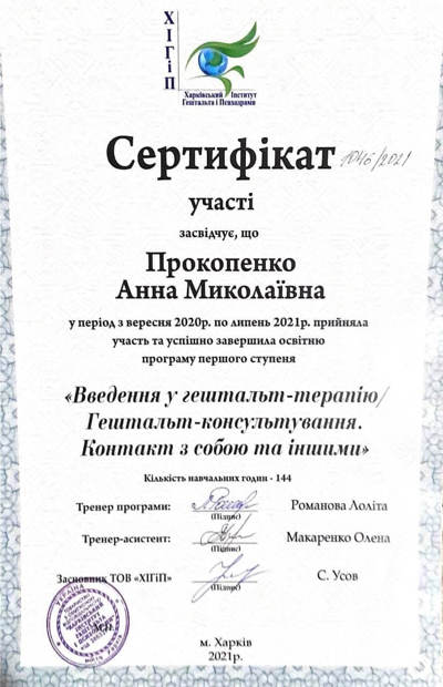 2021 рік - навчальна програма І ступеня ХІГіП «Вступ до гештальт-терапії/гештальт-консультування. Контакт із собою та іншими»;