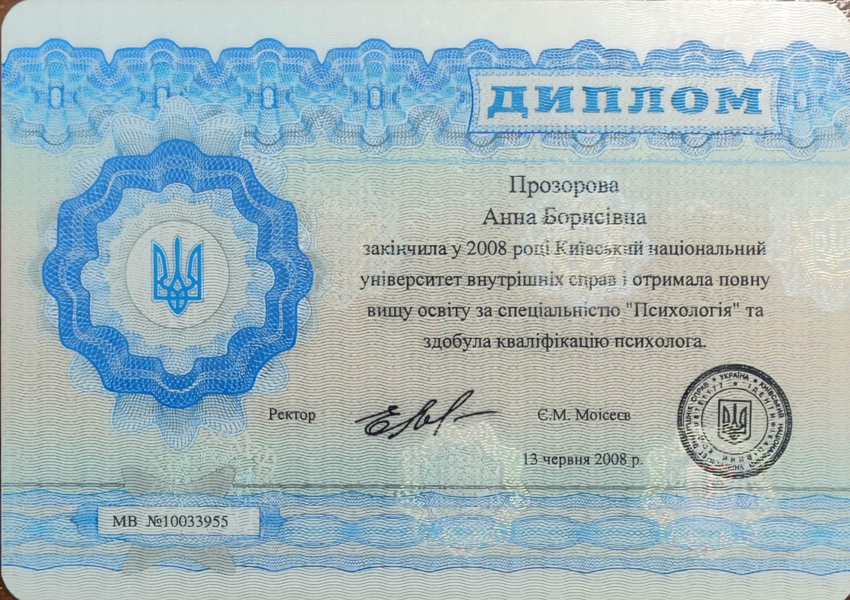 2003-2008рр Київський національний університет внутрішніх справ. Диплом спеціаліста за напрямком Практична психологія.