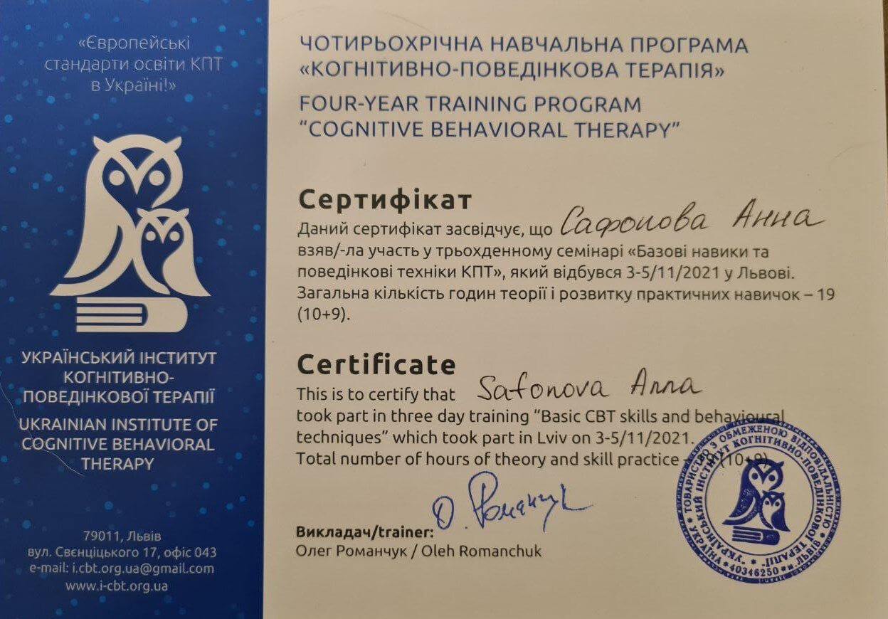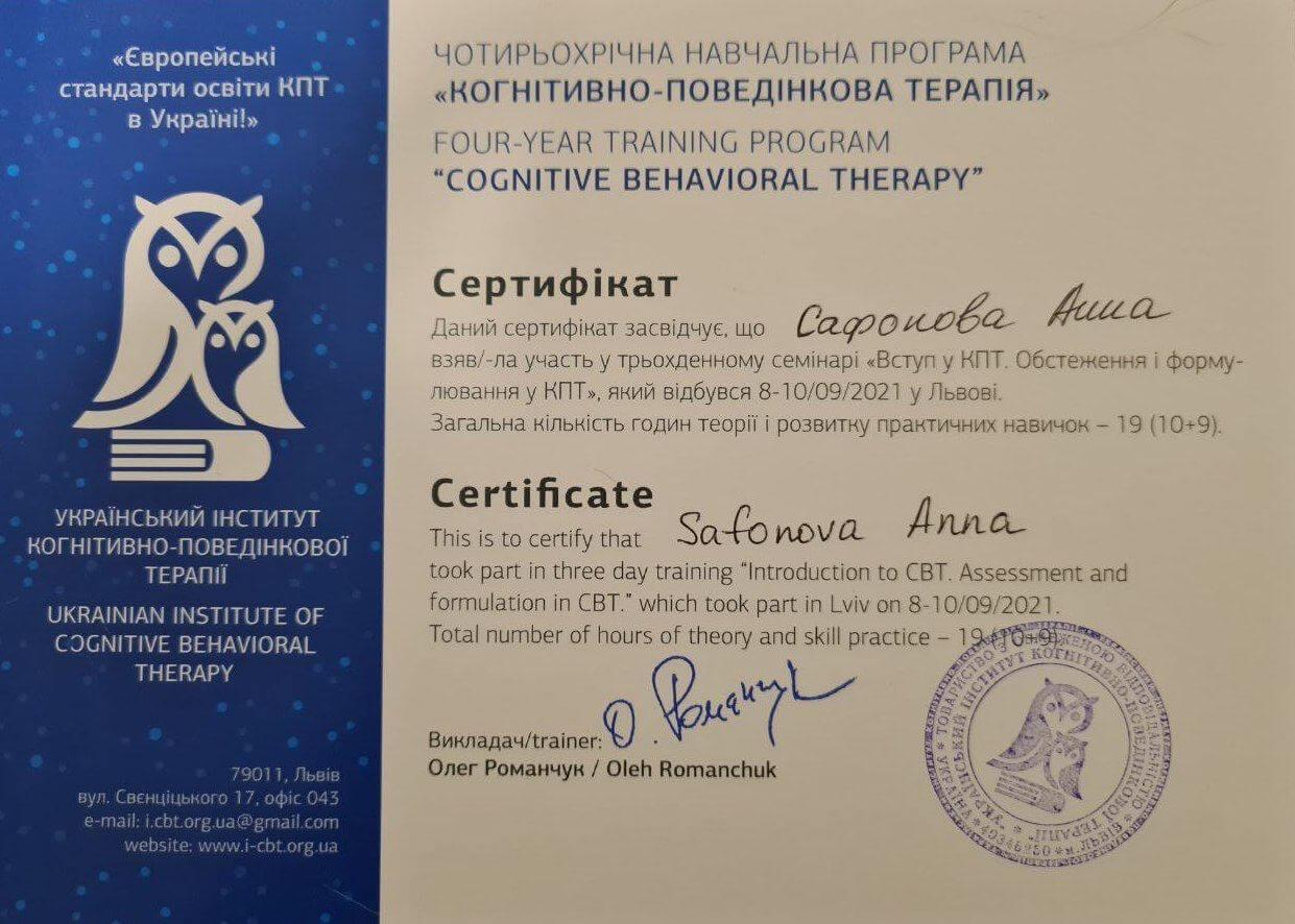 З 2021 року навчаюсь на чотирьох літньому проекті в Українському інституті Когнітивно-Поведінкової терапії.