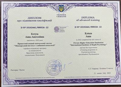 Я психолог психоаналитической ориентации, имею разрешение на практику от украинской ассоциации психоанализа, членом которой являюсь. Регулярно прохожу курсы повышения квалификации, являюсь участником постоянных супервизионных групп. Имею опыт прохождения личного тренингового психоанализа, более 3-х лет.