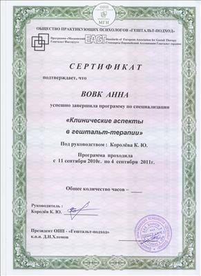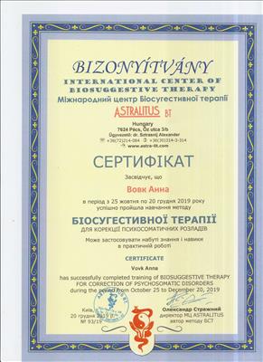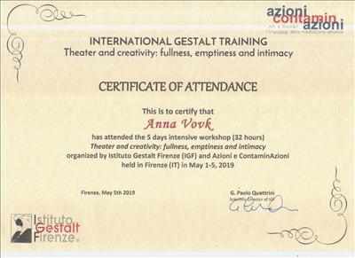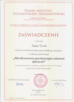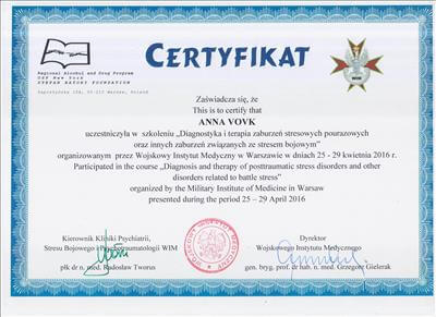Варшавський медичний інститут (робота з післявенним синдромом, ПТСР), Польський інститут інтегративної психотерапії (робота з депресивними та тривожними розладами)