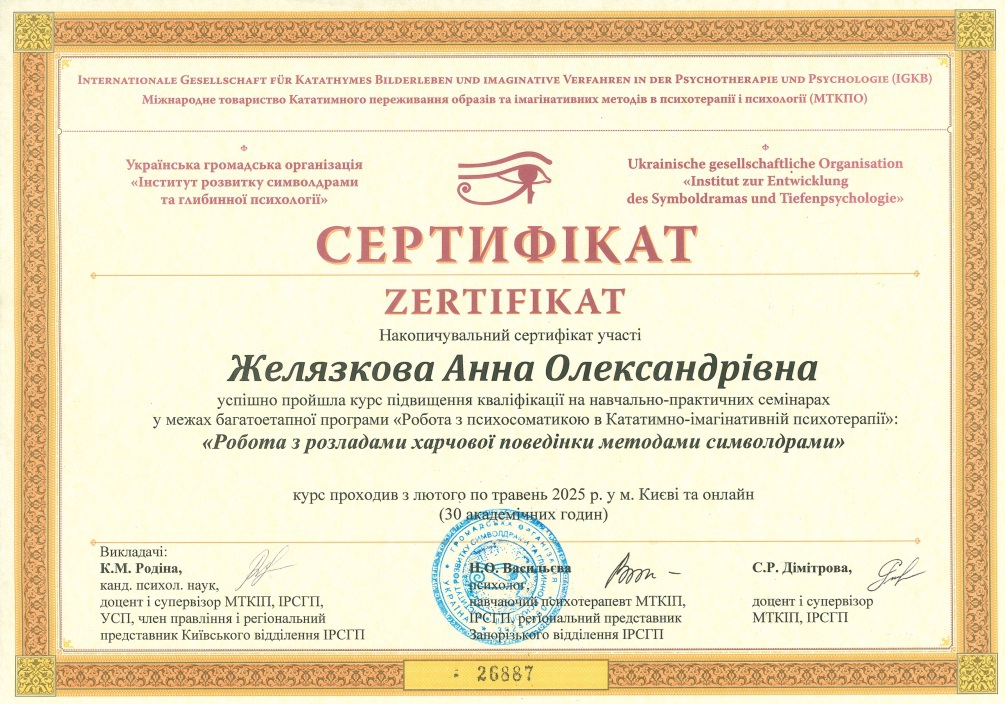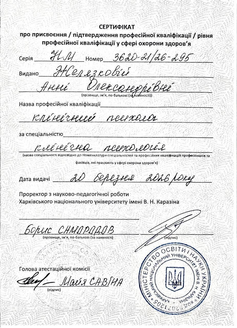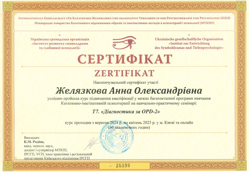 Також використовую принципи психоаналізу, OPD-2, тілесно-емоційної стабілізації та сучасних доказових підходів.