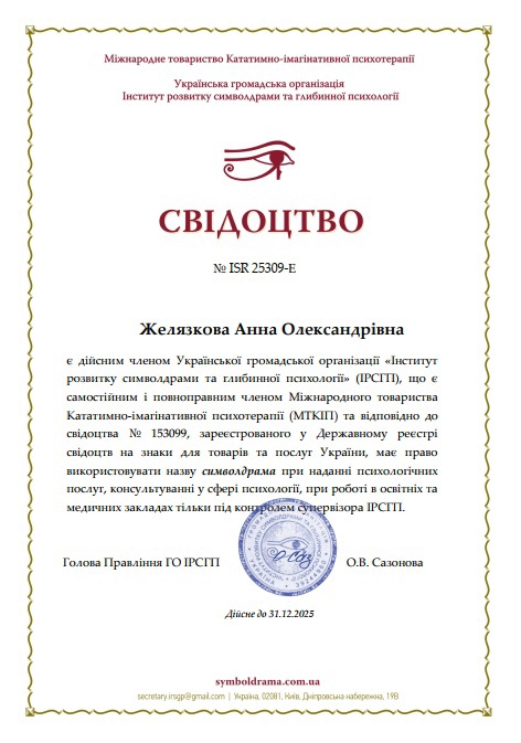 Мій провідний метод — кататимно-імагінативна психотерапія (КІП). Це глибинна психотерапія, яка працює з внутрішніми образами у стані релаксації. Через символи, уяву і діалог ми отримуємо доступ до матеріалу, який часто недоступний у звичайній розмові — до витіснених емоцій, незавершених процесів, ранніх конфліктів.