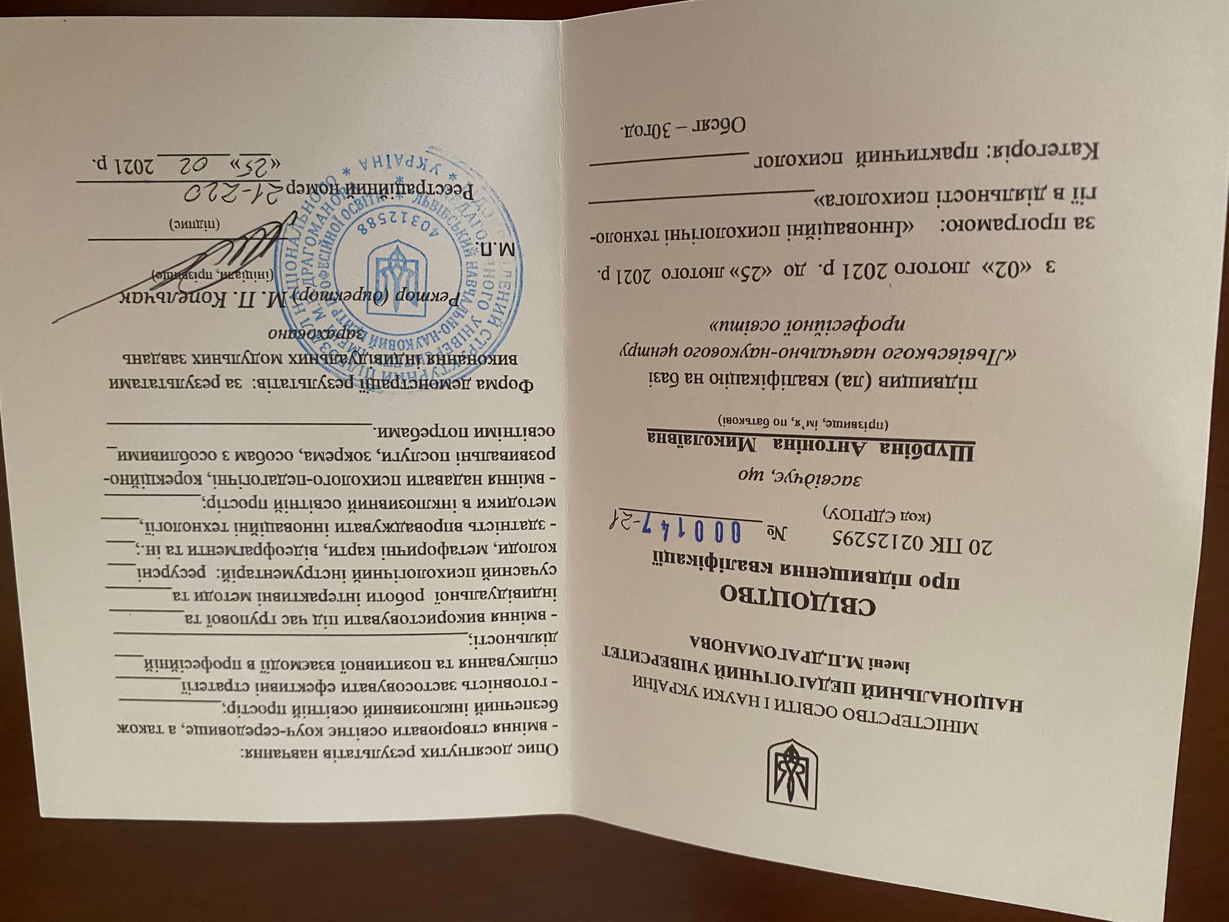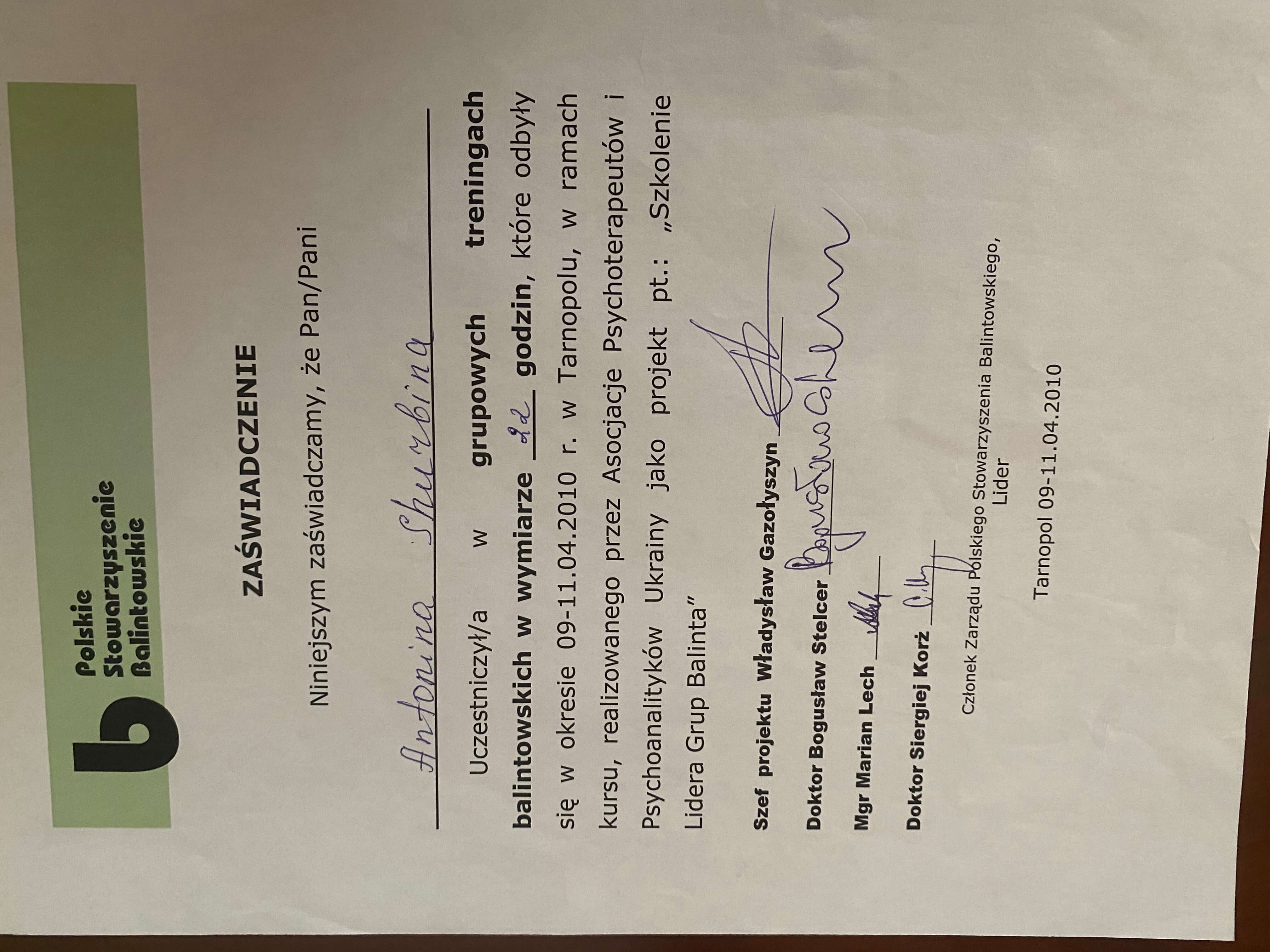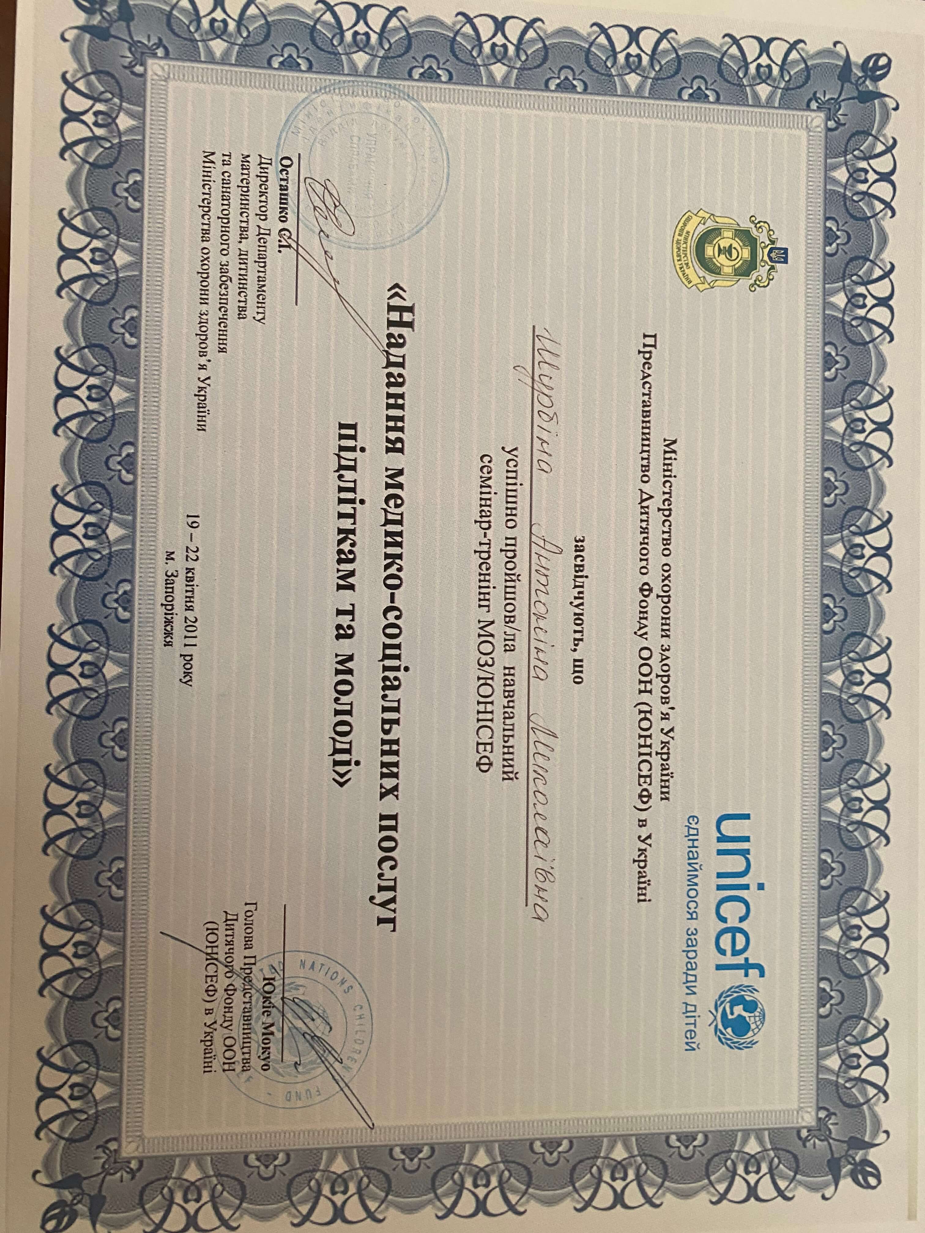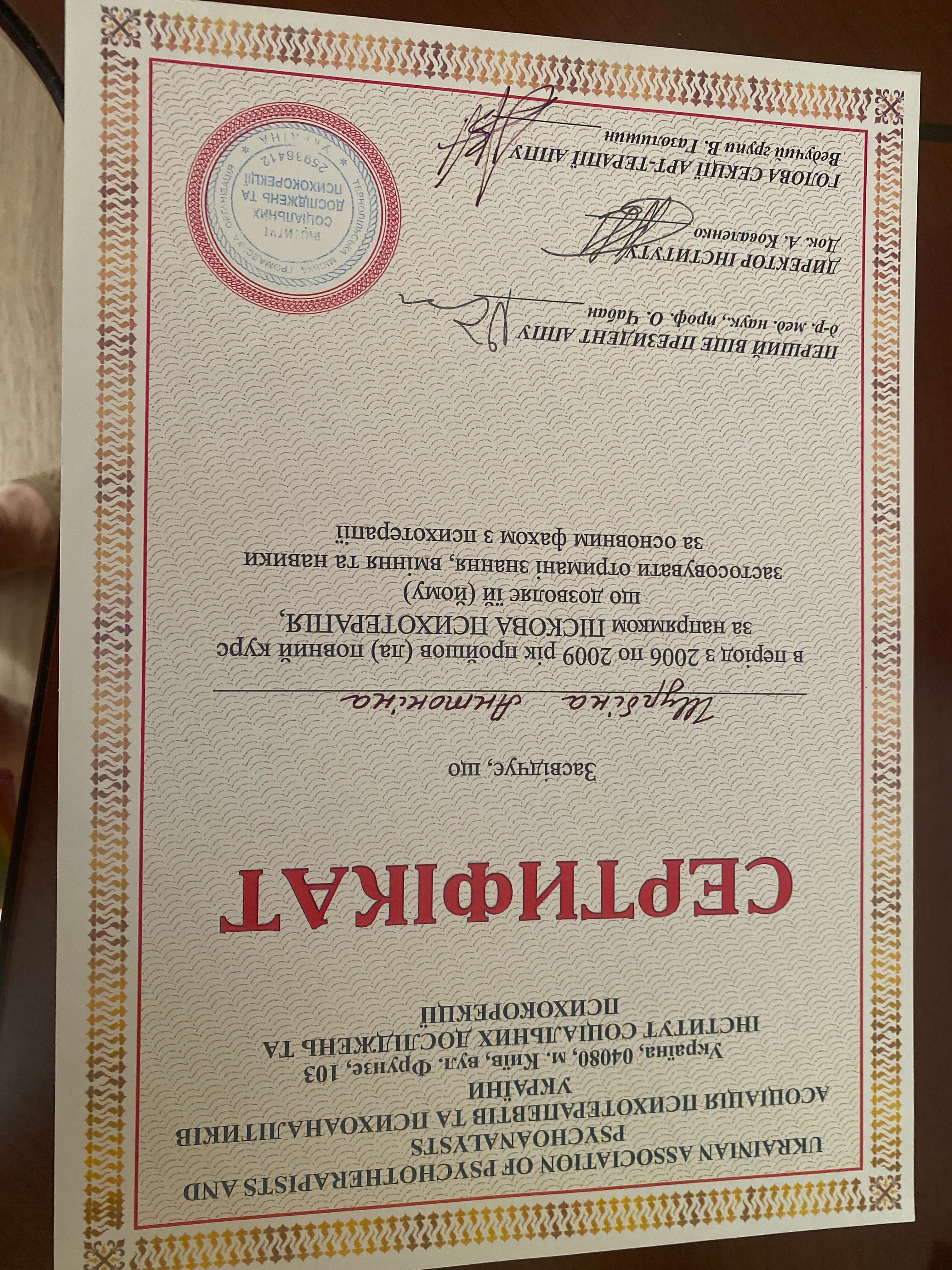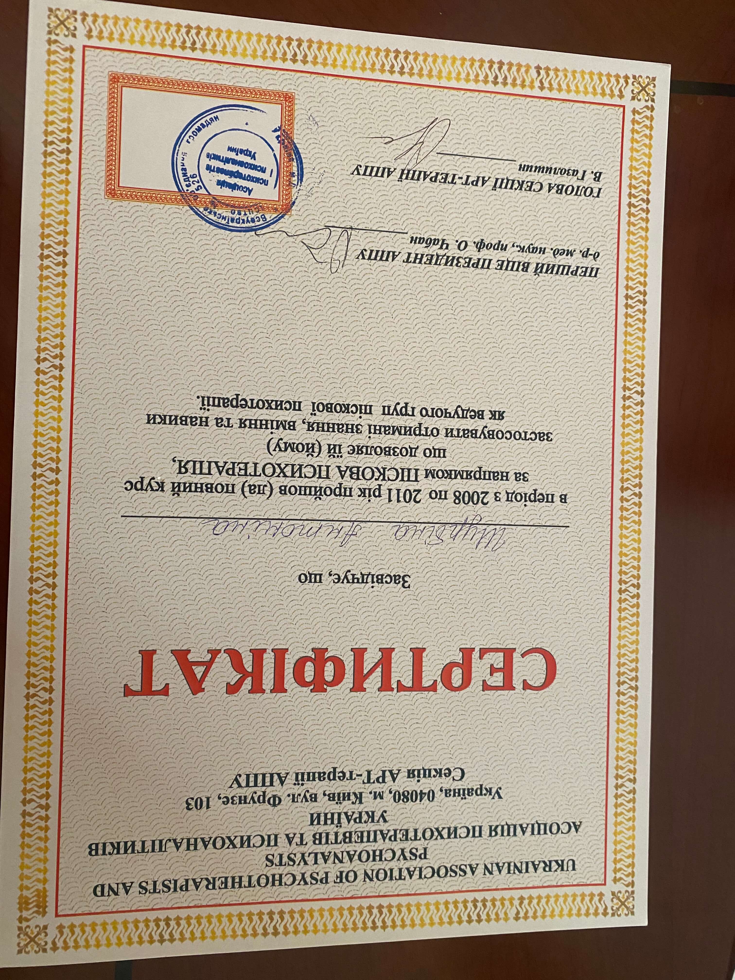 Миколаївський державний педагогічний інститут, факультет, практична психологія. Кримський центр гештальт терапії сертифікат. Навчально-практичний семінар: психотерапія психосоматичних та депресивних розладів за допомогою методів Символдрами, 2003 рік. Навчально - практичний семінар: ПсиходинамікаІна корекція емоціїФетхіє розладів засобами Ігрової, тілесної, Арт-терапевтії., 2004 р. Інтегративна психотерапія 3ависимого поведінки., 2005р. Сертифікат з пісочної терапії, 2008-2011 рік провідна груп з пісочної психотерапії. Сертифікат 2006-2009 рік психотерапевт із пісочної психотерапії. Сертифікат Unisef з підготовки фахівців для роботи в Клініках, дружніх до молоді у 2008 та 2011 роках.