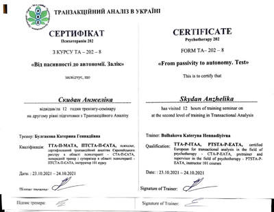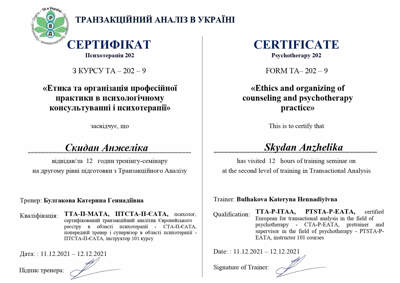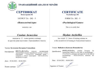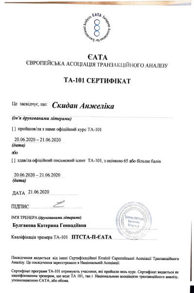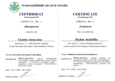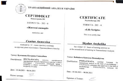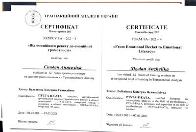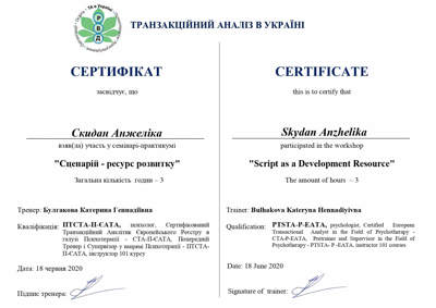 - Сертифікат Української Спільноти Транзактного Аналізу "Сценарій ресурс розвитку" (червень 2020 року, Київ, Україна).