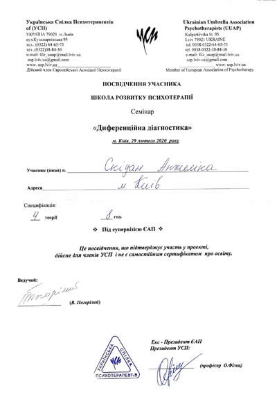 – 02.2020 – Школа Розвитку Психотерапії Української Спілки Психотерапевтів курс «Диференційна діагностика».
