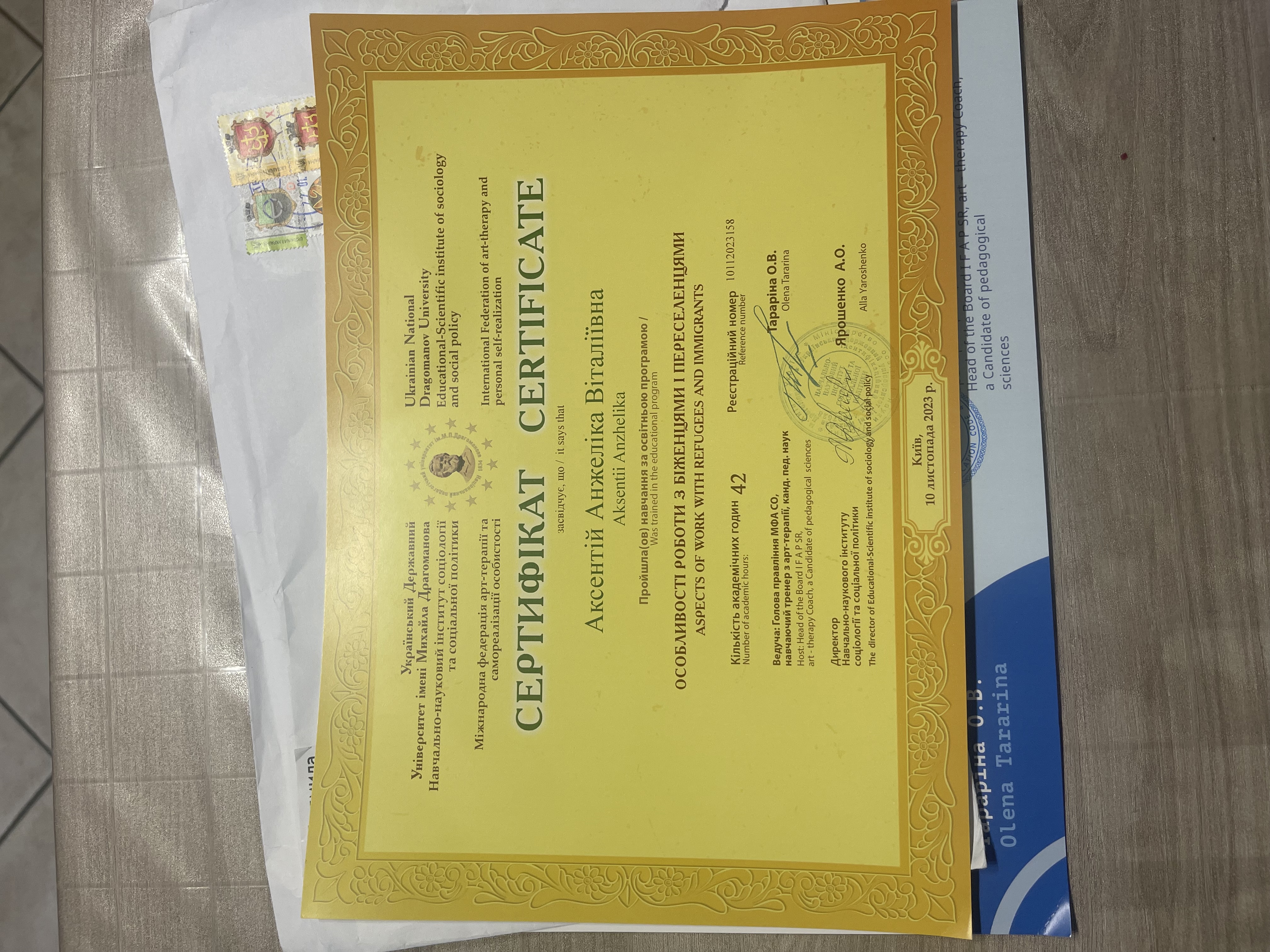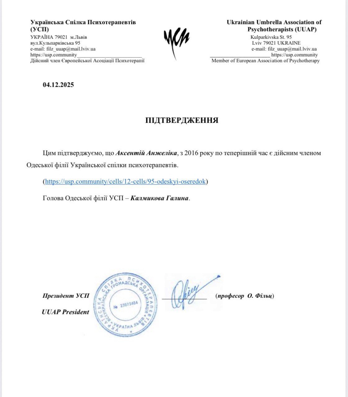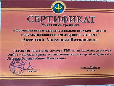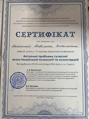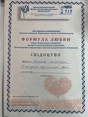 Член Української спілки психотерапевтів. Теренр особистісного зростання, автор тренінгів та групових програм. з Участь у благодійних проектах, ведення семінарів, нагороджена почесною грамотою.