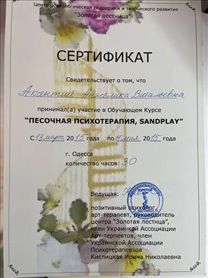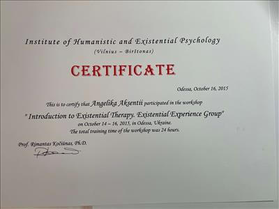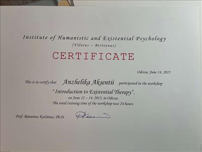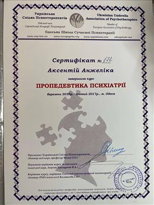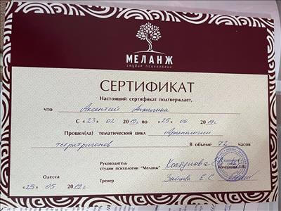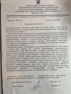 З 2014 року: провідна психотерапевтична група з пацієнтами стаціонару та амбулаторії до «Одеського медичного центру психічного здоров'я». Академіка Воробйова 9, (нагороджена листом подяки).