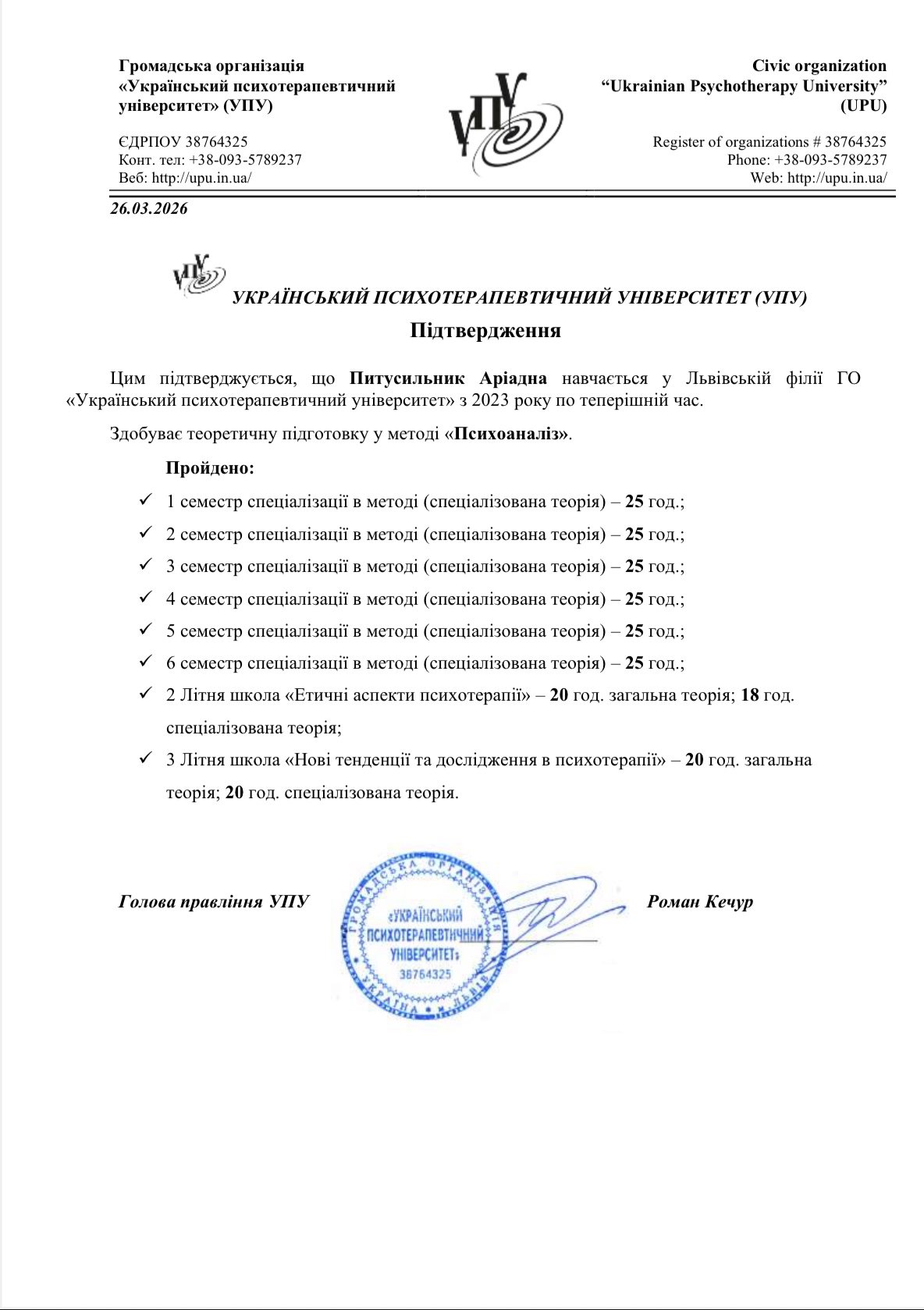 Зараз здобуваю сертифікацію у психотерапевтичному напрямі «Психоаналіз».