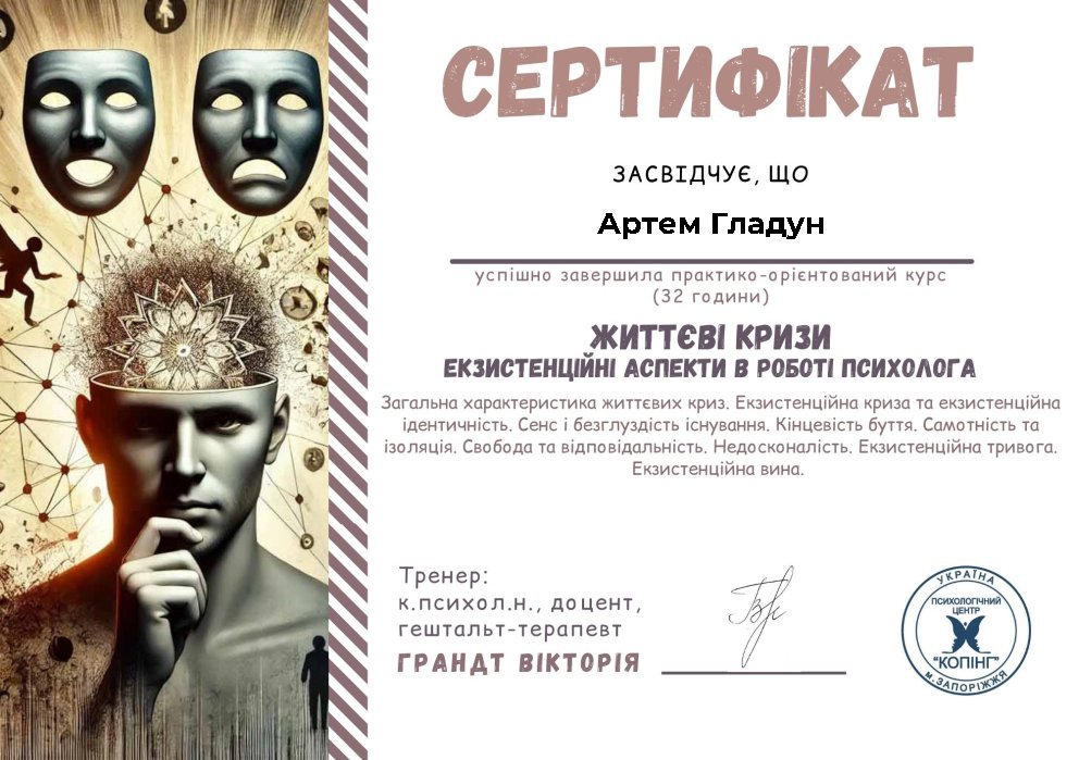 Психотерапія для мене – це не просто професійний шлях, а мій особистий простір для зростання та трансформації. Гештальт-підхід, з акцентом на теперішньому моменті, на дослідженні відчуттів, почуттів, потреб та особистих кордонів, навчив мене діяти вільніше й усвідомленіше у власному житті. Я не лише знаю про психологію з підручників, а й проживаю її щодня, відчуваючи її вплив. Результатом стали 17 років міцних, довірливих стосунків з коханою дружиною, радість батьківства, щастя нашої дитини, турбота про своє фізичне та емоційне здоров'я, стійкість у складних ситуаціях і впевнене професійне зростання у справі, яку люблю. Я переконаний, що психологія - це не лише знання, а передусім жива практика, яка допомагає нам будувати усвідомлене та повноцінне життя. І мій власний досвід є цьому підтвердженням.
