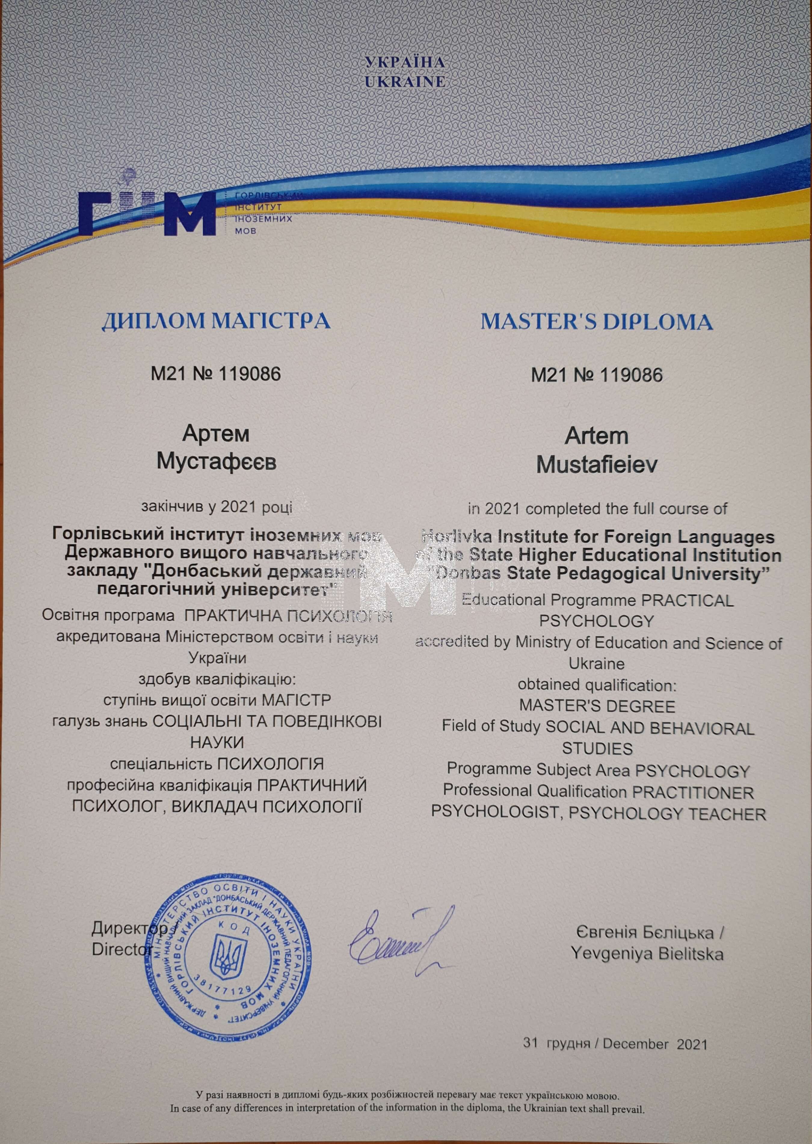 Горлівський інститут іноземних мов Державного вищого навчального закладу "Донбаський державний педагогічний університет, отримав кваліфікацію МАГІСТР, галузь знань СОЦІАЛЬНІ ТА ПОВЕДІНКОВІ НАУКИ, спеціальність ПСИХОЛОГІЯ.