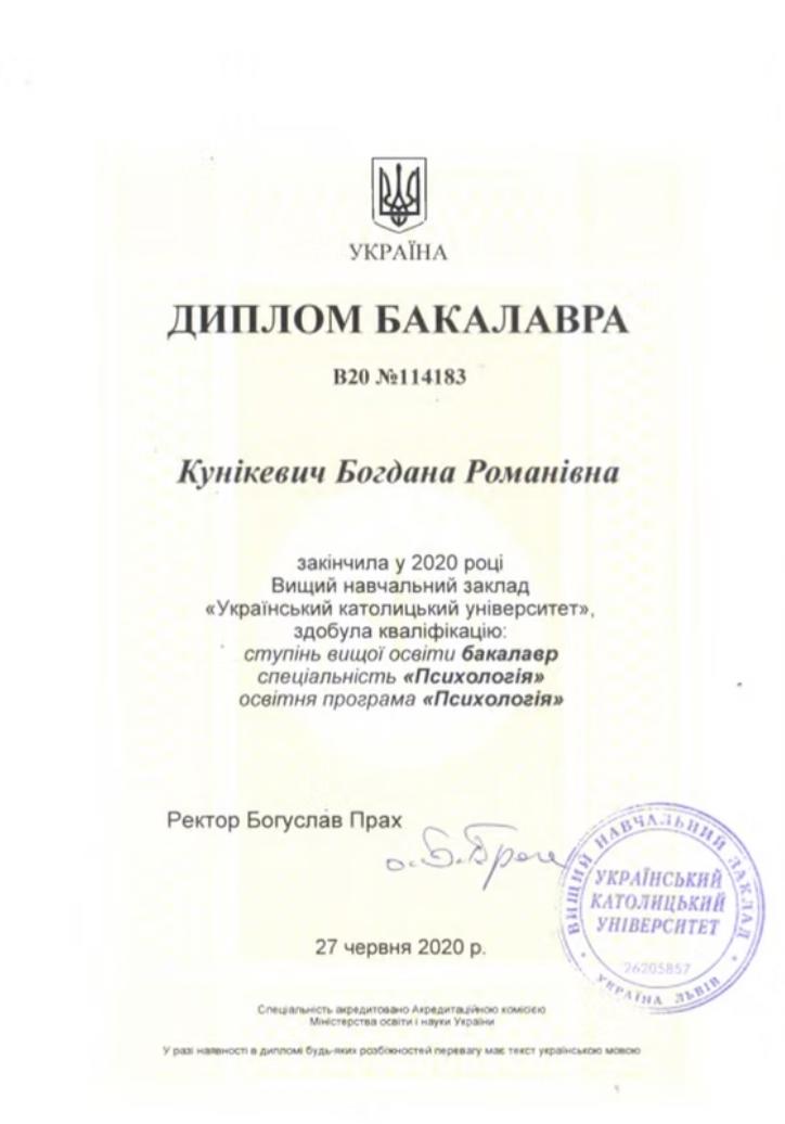 Базова освіта: бакалаврат та магістратура Українського Католицького Університету (Психологія та Клінічна психологія з основами психодинамічної психотерапії)