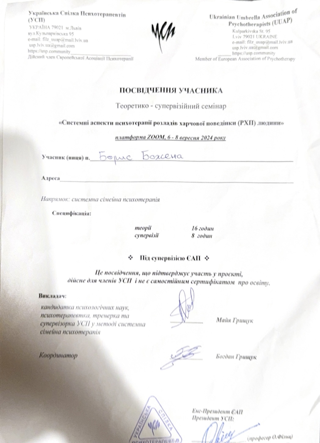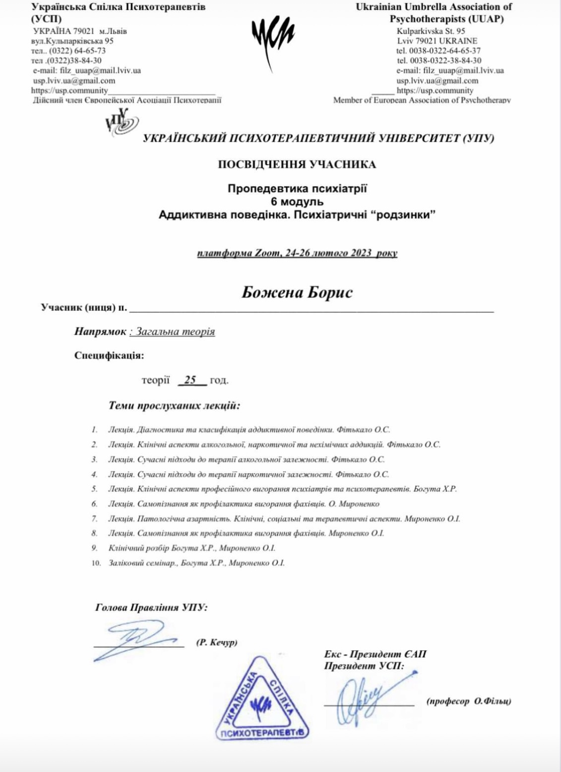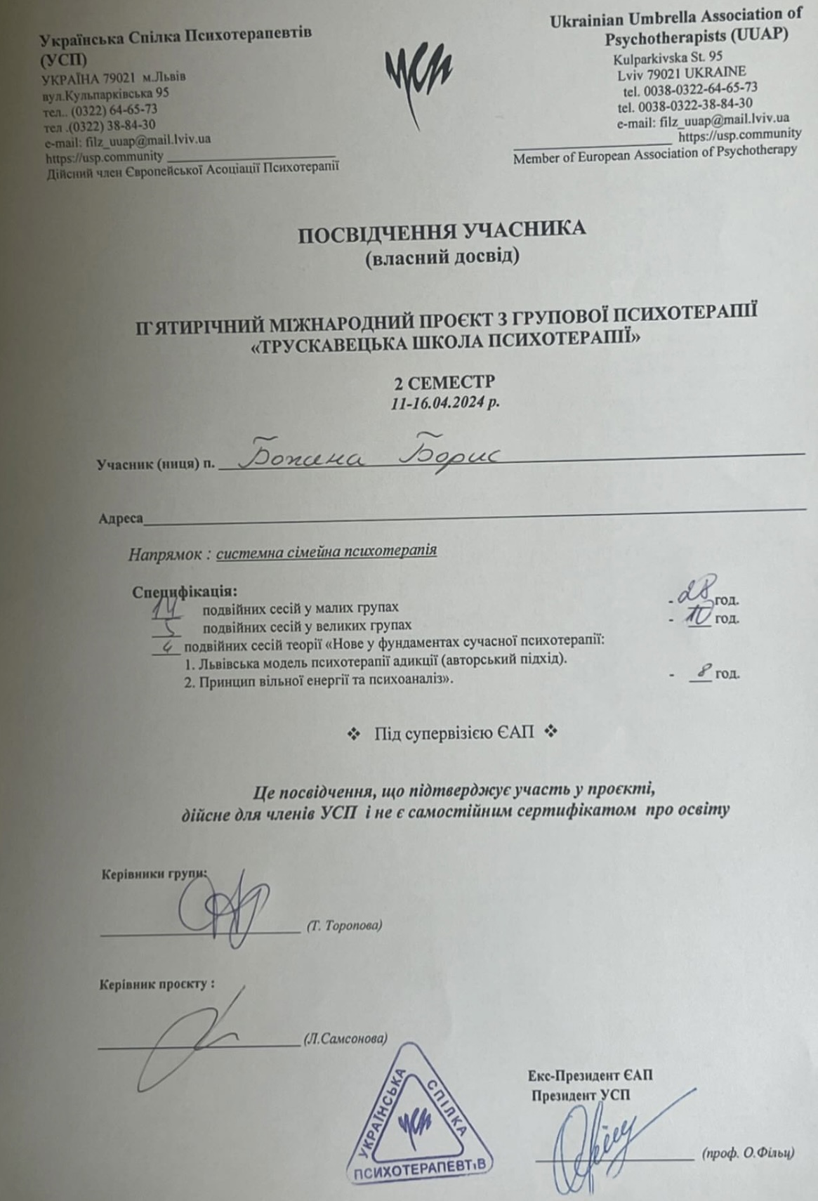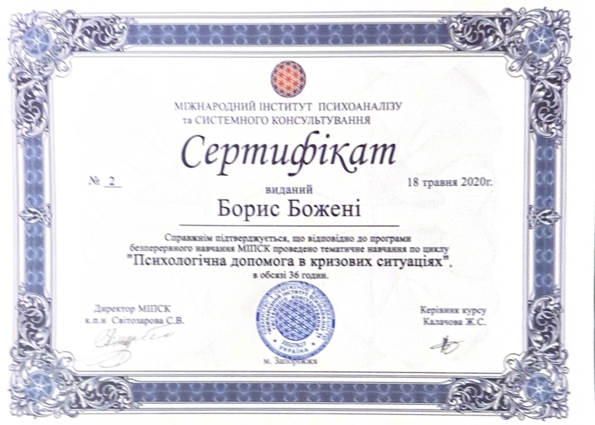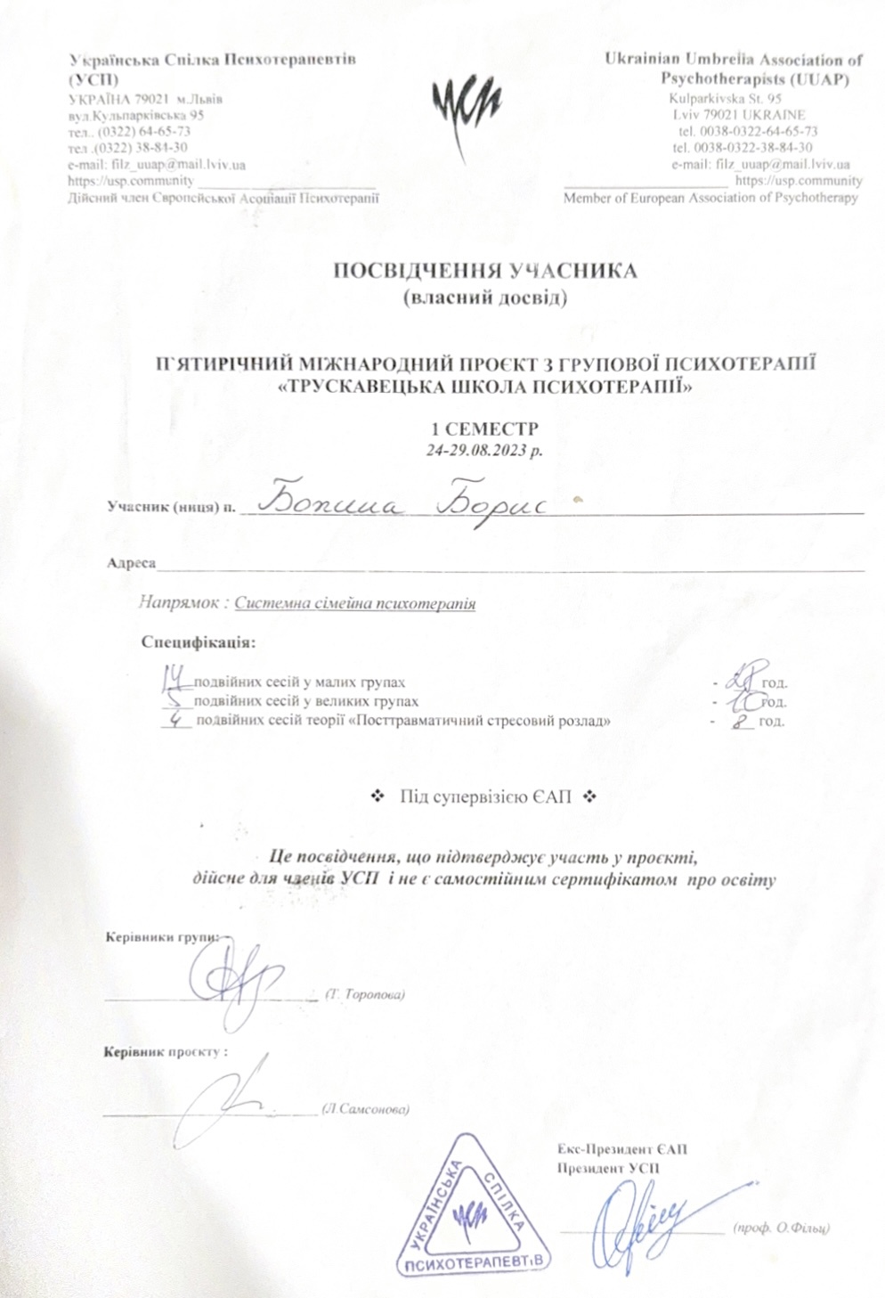 Український психотерапевтичний університет - кандидат в системно-сімейного психотерапевта;