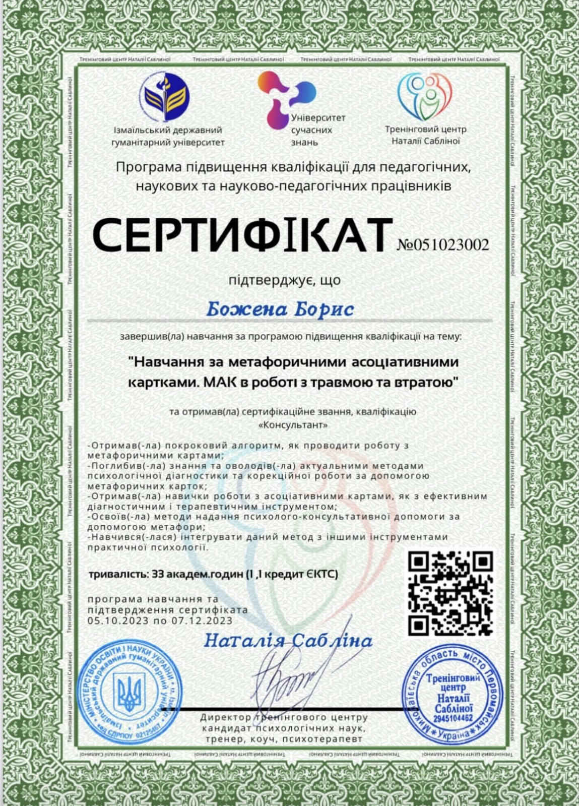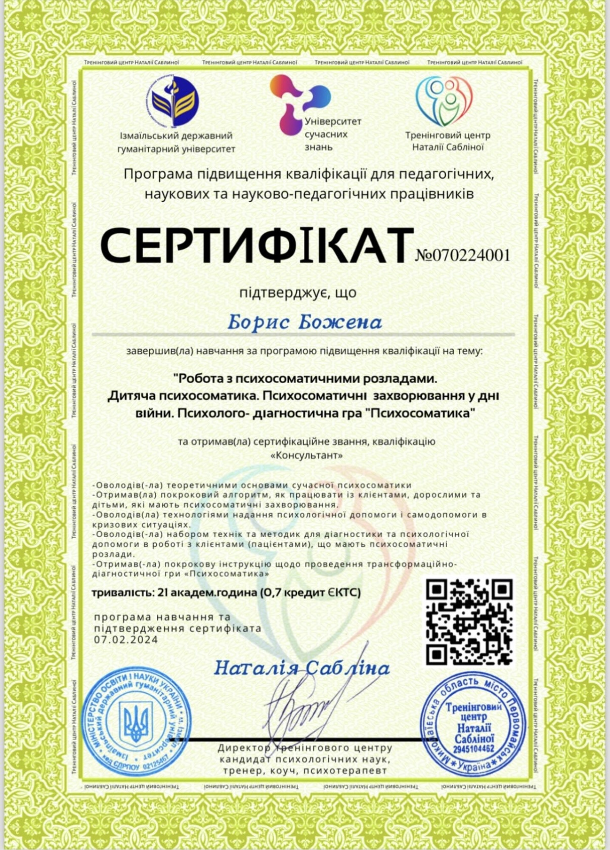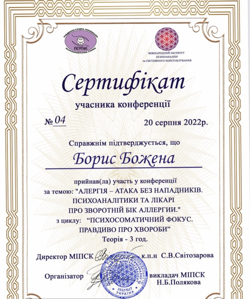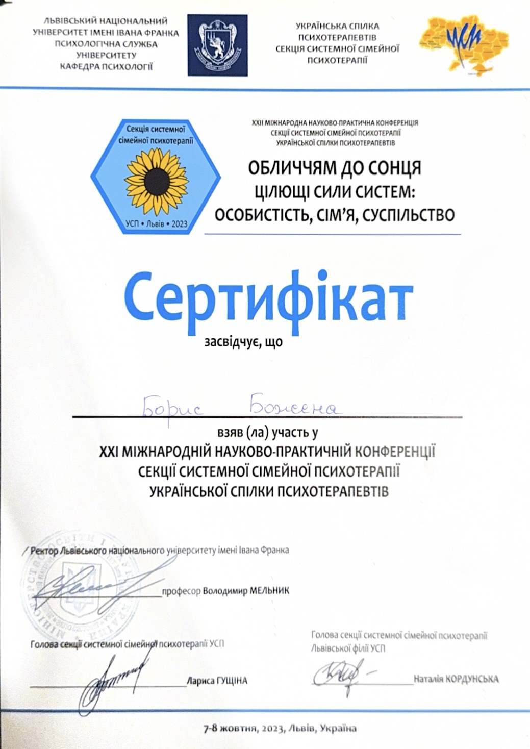 Український психотерапевтичний університет - кандидат в системно-сімейного психотерапевта;