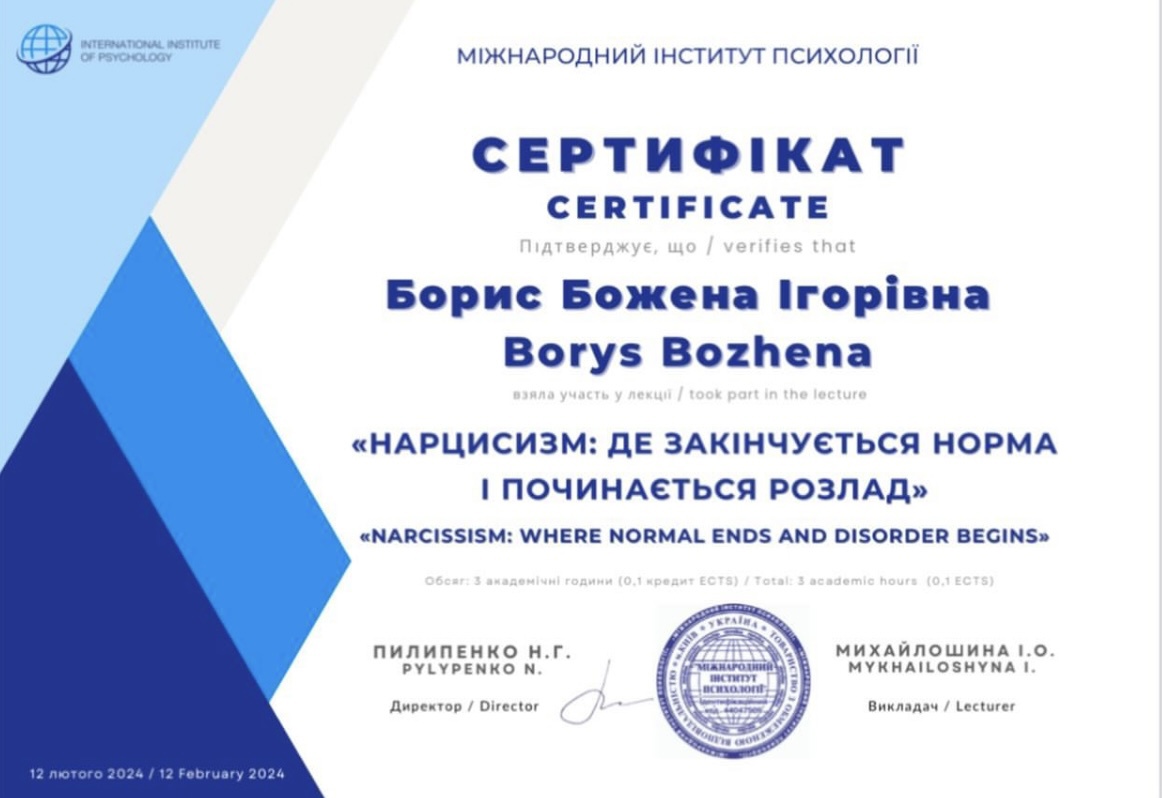Міжнародний інститут психології - основи КПТ, психоаналіз підлітків, антисоціальний розлад особистості, нарцистичний розлад особистості .