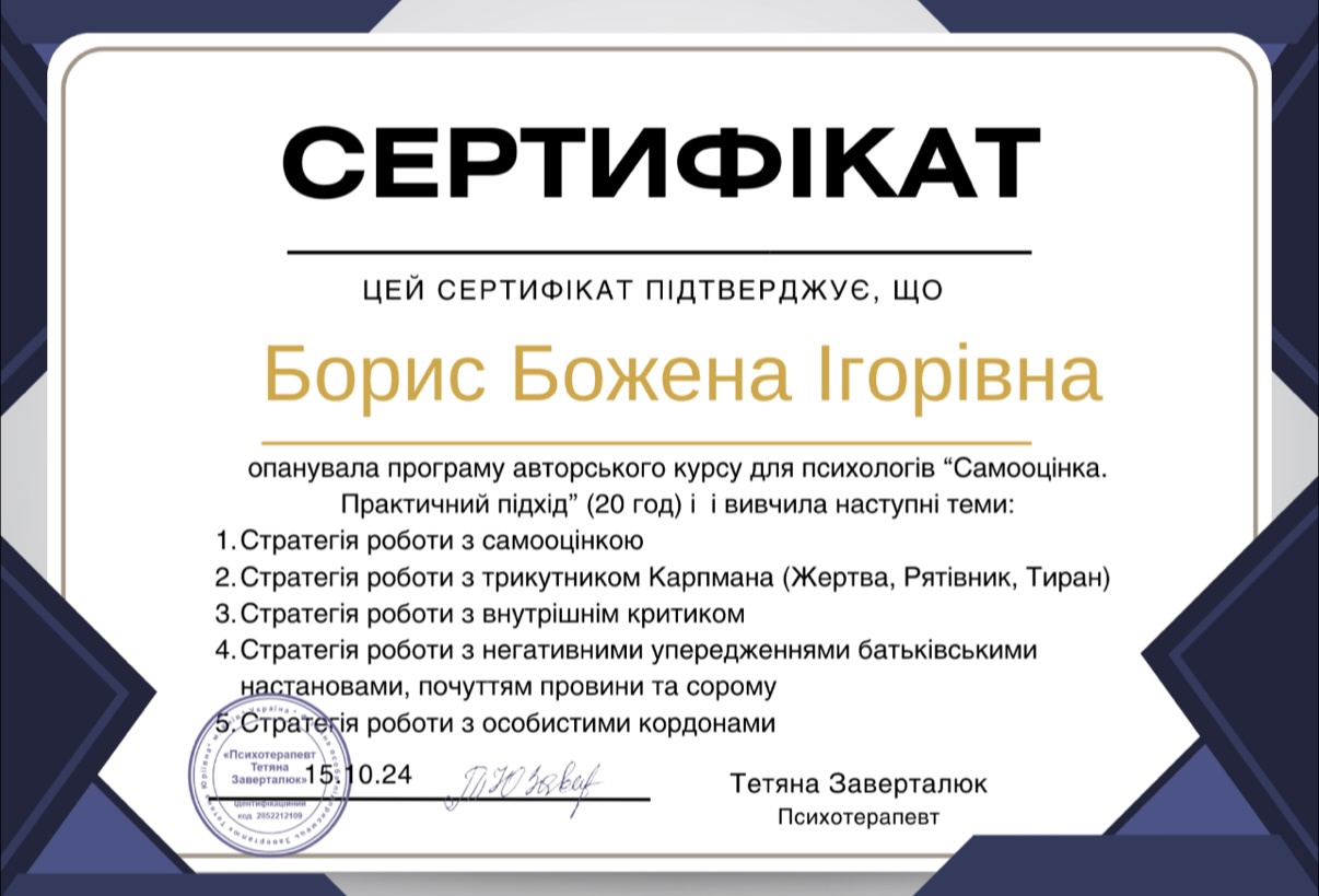 Привіт! Мене звати Божена, я клінічний психолог та психотерапевт. У своїй роботі я використовую комплексний підхід, поєднуючи психоаналіз, сімейну терапію, КПТ, психосоматику та арт-терапію.