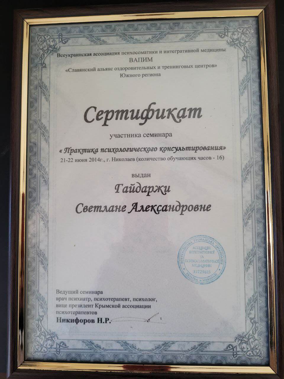 Всеукраинская ассоциация психосоматики и интегративной медицины ВАПИМ «Славянский альянс оздоровительных и тренинговых центров» Южного региона