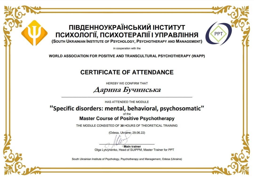 Я завжди була сумлінною студенткою з високим рівнем вимог до себе та щирою зацікавленістю до своєї професії. Це допомогло мені стати гарним фахівцем у сфері психічного здоров'я.