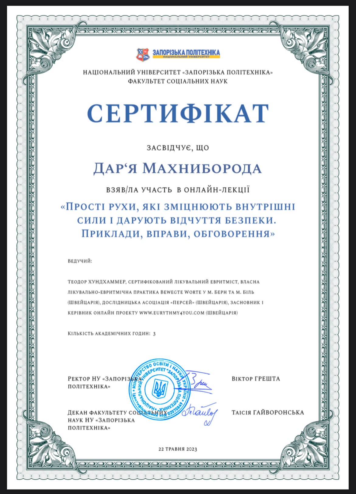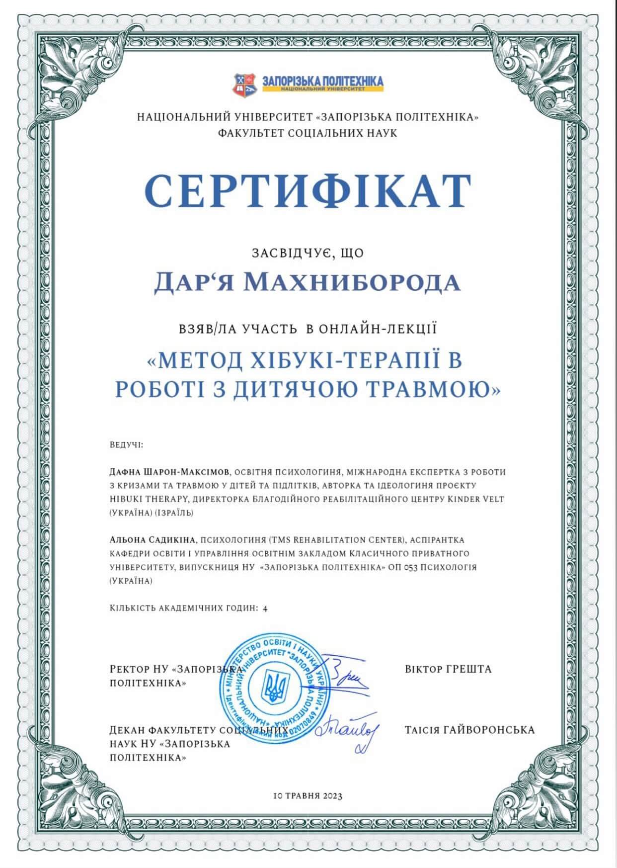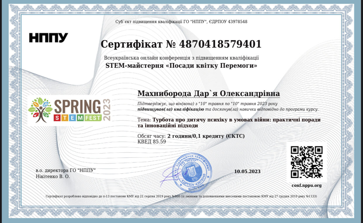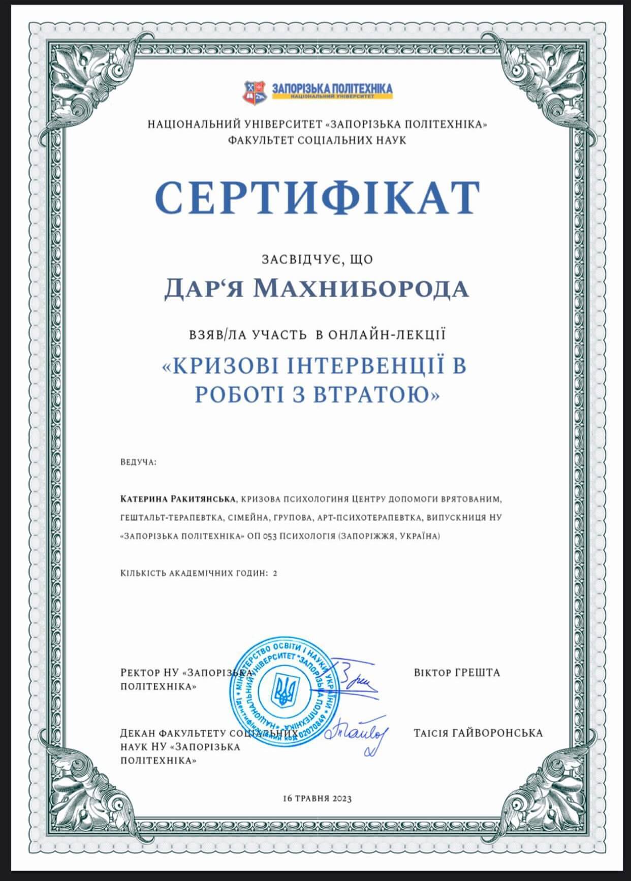 Магістратура «Психологія» в Національному університеті «Запорізька політехніка». Курси: курс психологічної реінтеграції ВПО, гендерна рівність та протидія сексуальним домаганням в військовій сфері, батьківство без гендерних стереотипів, щоденник самодопомоги жінкам які постраждали від домашнього насильства, знати як допомогти і т.д….