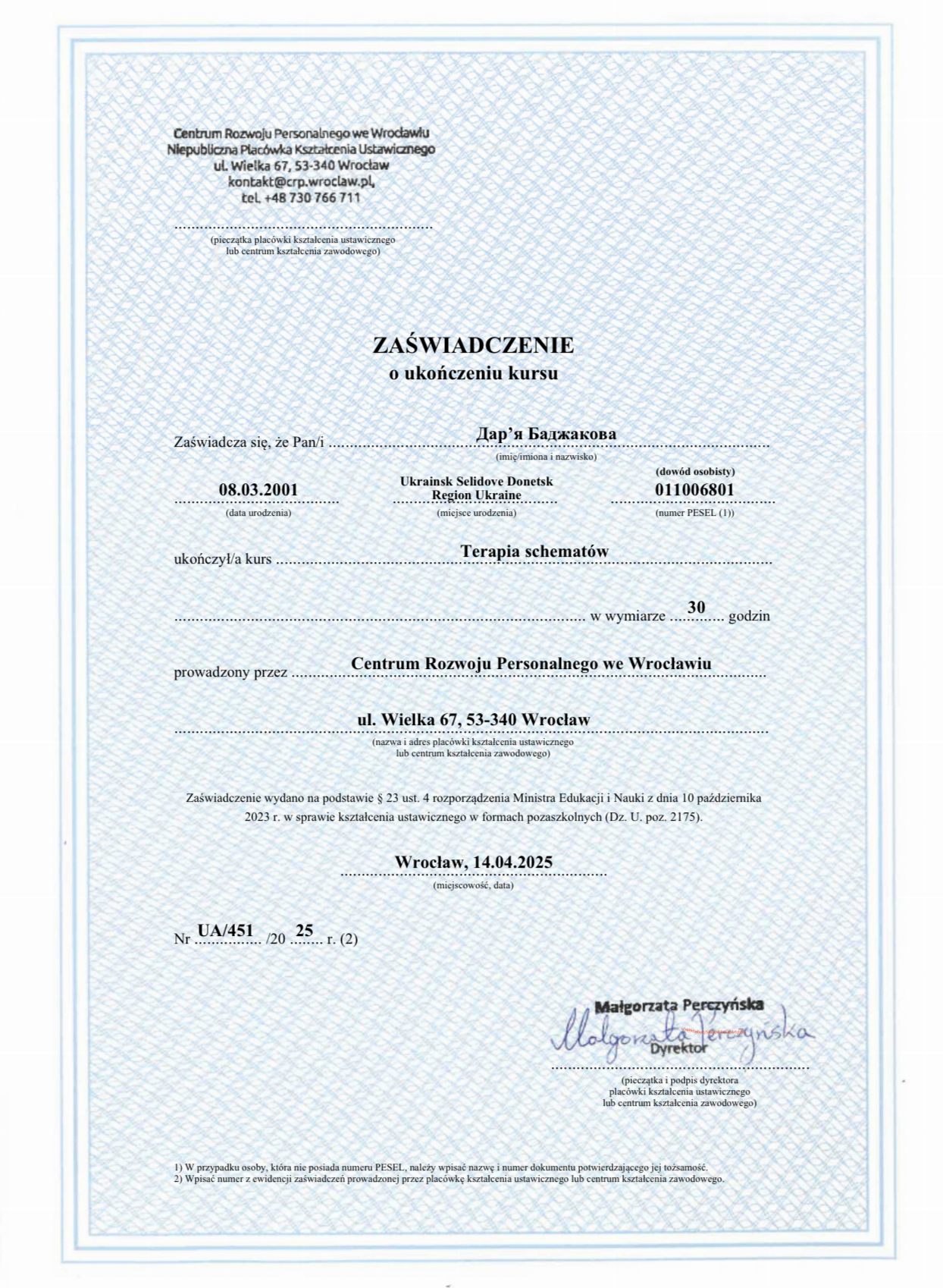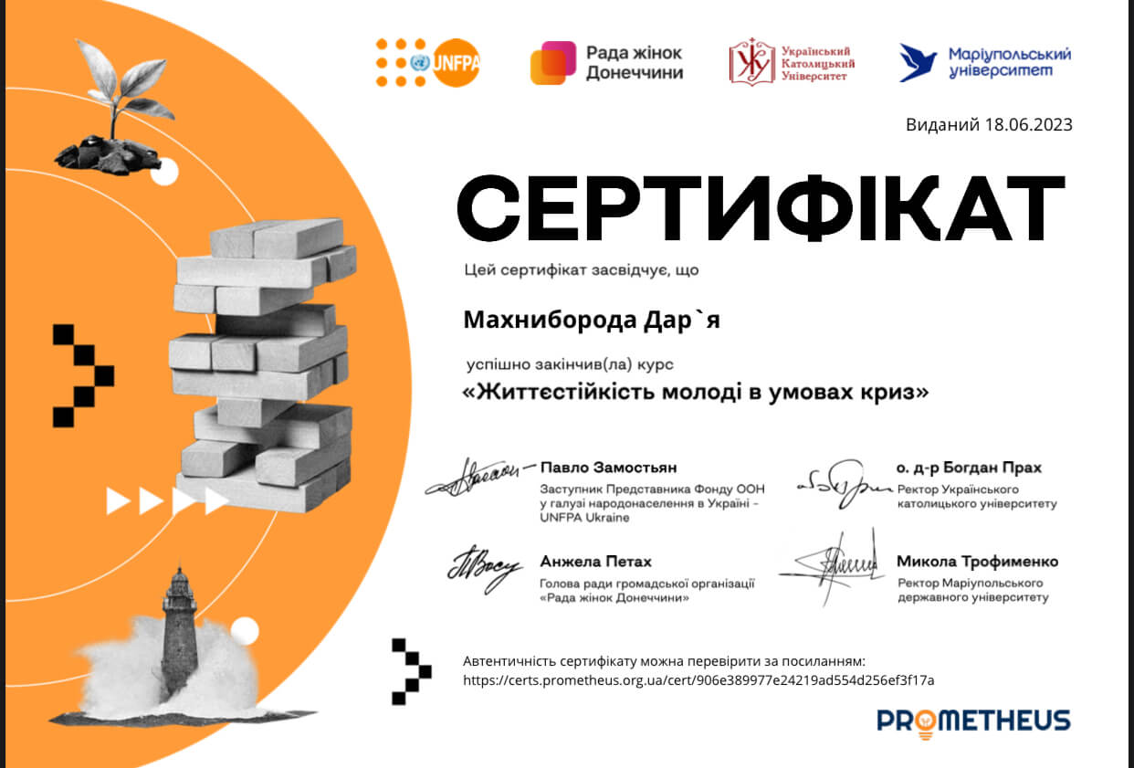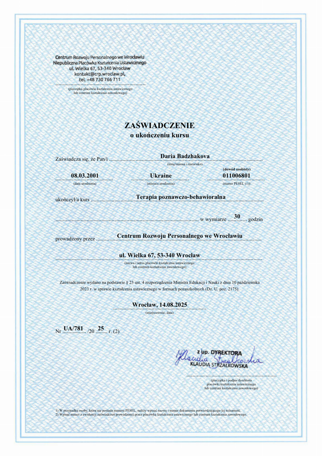 Магістратура «Психологія» в Національному університеті «Запорізька політехніка». Курси: курс психологічної реінтеграції ВПО, гендерна рівність та протидія сексуальним домаганням в військовій сфері, батьківство без гендерних стереотипів, щоденник самодопомоги жінкам які постраждали від домашнього насильства, знати як допомогти і т.д….