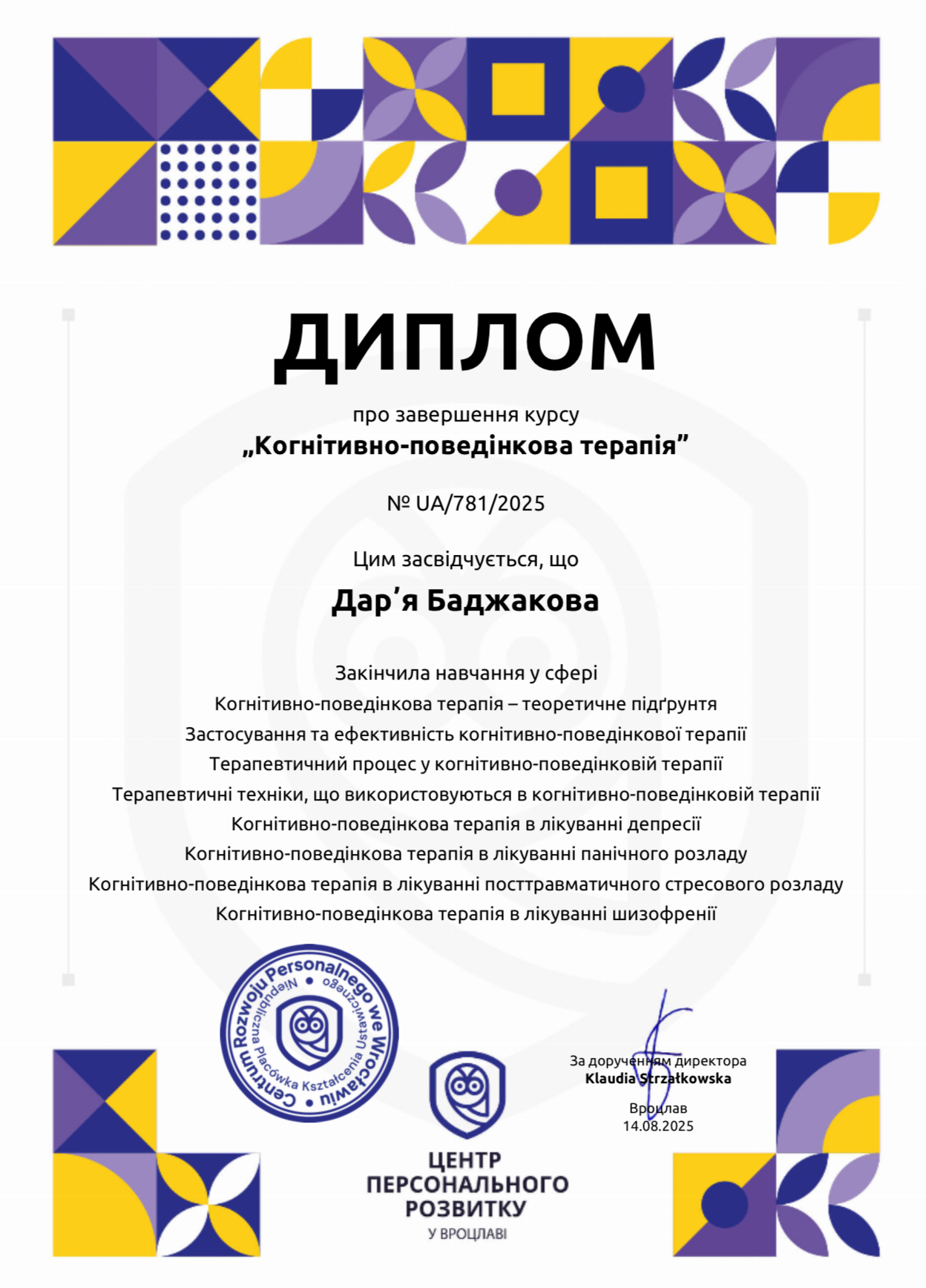 Я психологиня, цвяхотерапевтка. Працюю з інструментами КПТ, арт терапії, МАК. До кожного клієнта підбираю індивідуальний підхід, завжди поважаю його стан, емоції та почуття. З кожним клієнтом проходжу весь його шлях (надаю підтримку та можливість бути самим собою). З кожним з Вам готова розділити ваш момент життя, яким би він не був.