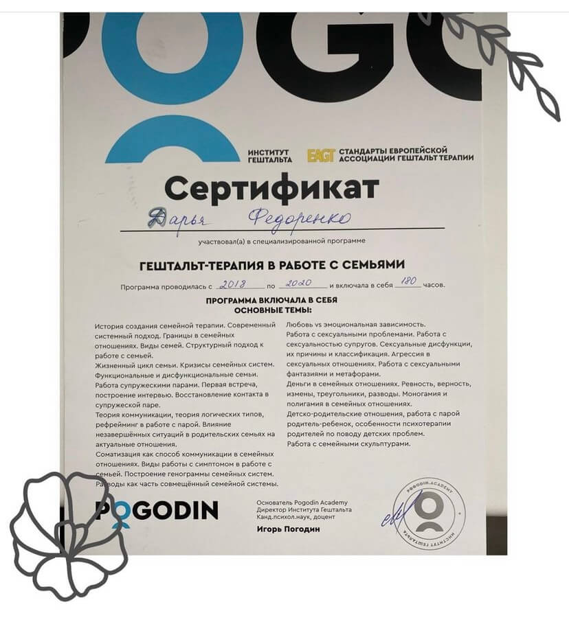 Кіспп «магістр психології», нлп-практик, тілесно-орієнтований терапевт, навчаюсь на 2 ступені гештальт терапії