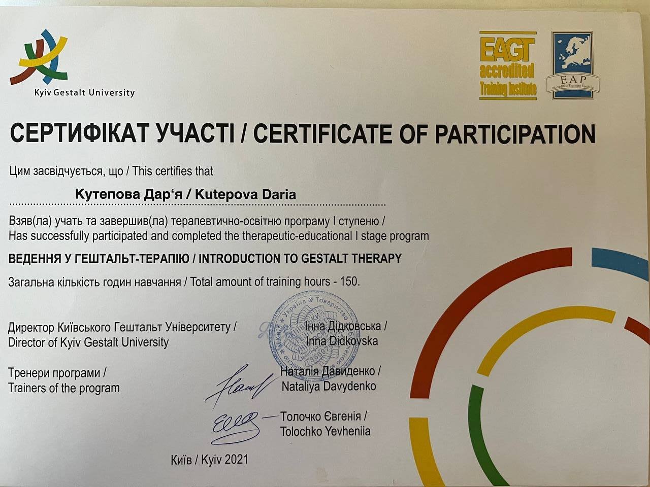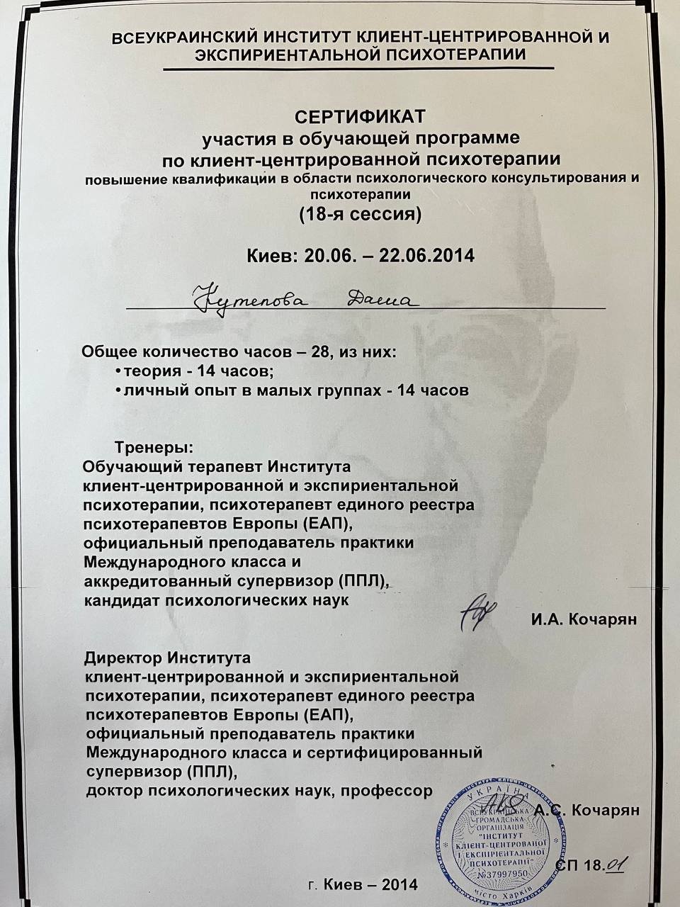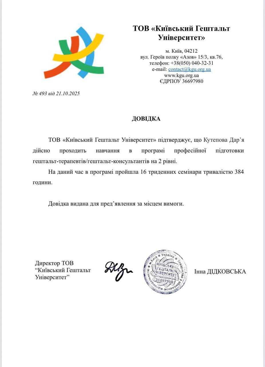 Мене звати Даша. Я дипломований психолог, навчалась на клінічній кафедрі КНУ ім. T. Шевченко. Проходила практику в психоневрологічній клінічній лікарні. Навчалась терапії в клієнт-центрованому підході і далі поглиблюю знання в гештальт підході, проходжу спеціалізацію по роботі з кризовими станами та травмою. Останні два роки співпрацюю з NGO-організаціями, де підтримую журналістів і медійників, які висвітлюють події війни та працюють у гарячих точках, а також членів родин полонених. Допомагаю дослідити способи витримувати стрес, невизначеність, емоційне виснаження. Маю досвід роботи з військовими.