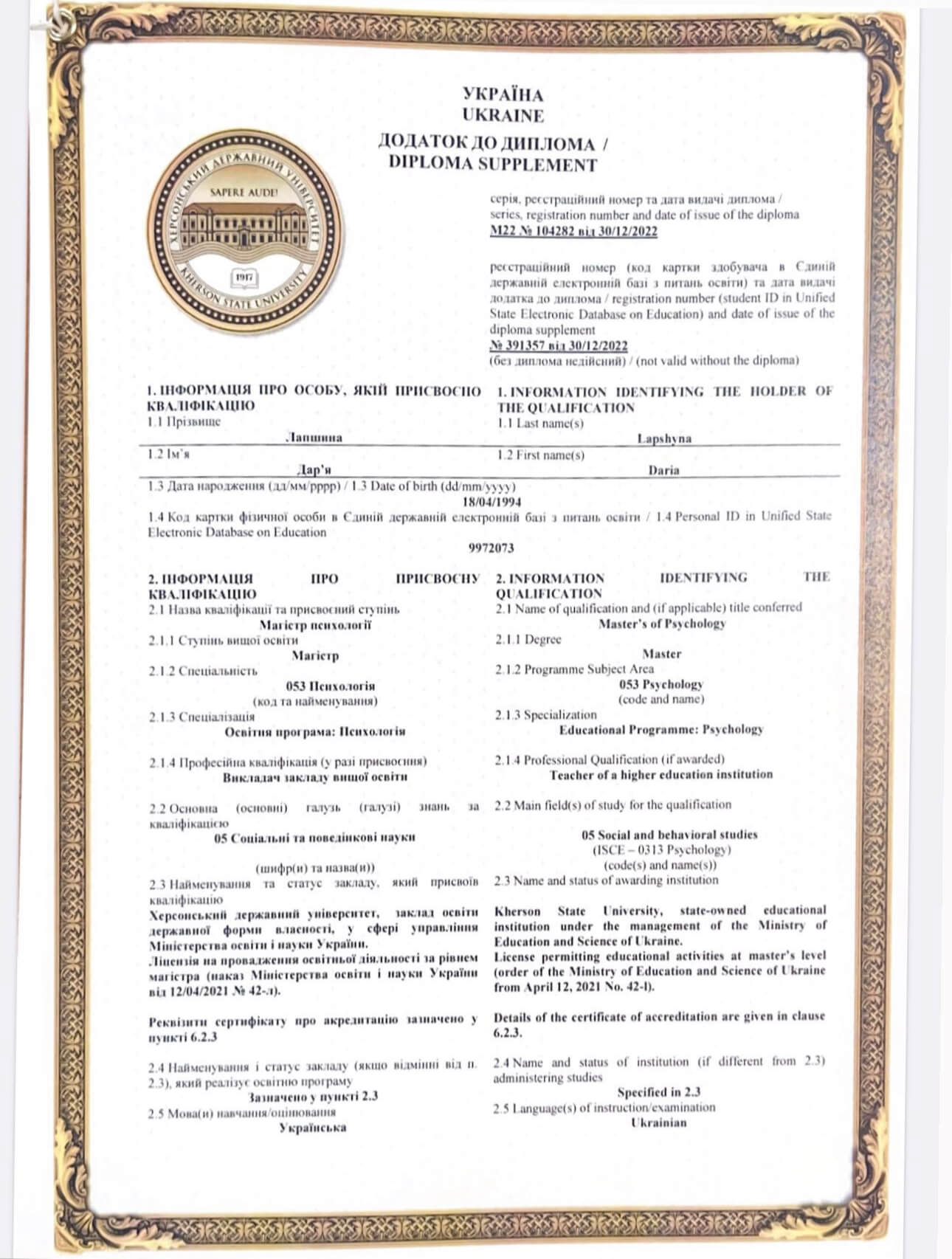 Херсонський державний університет, магістр Психології , викладач у вищих навчальних закладах.