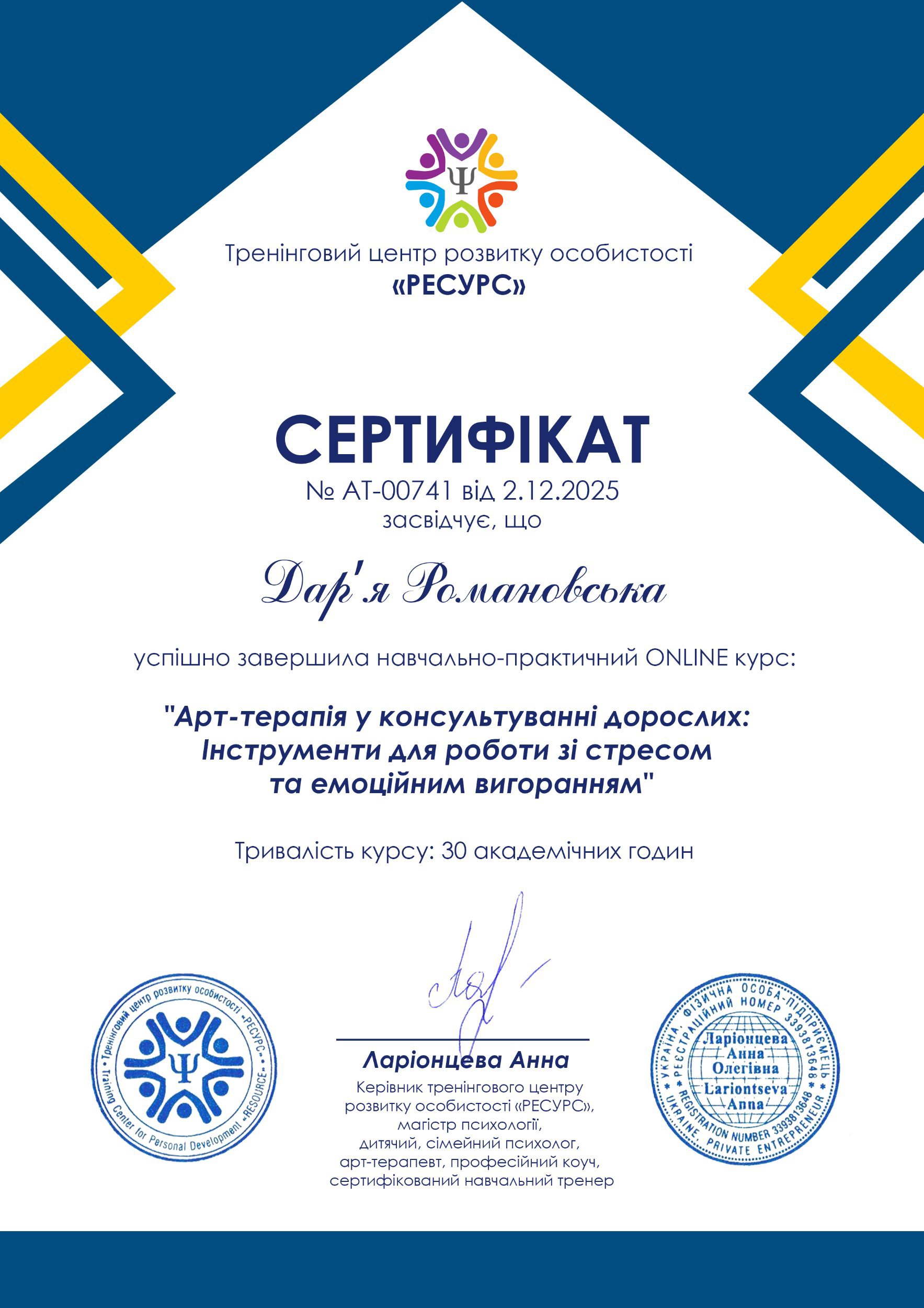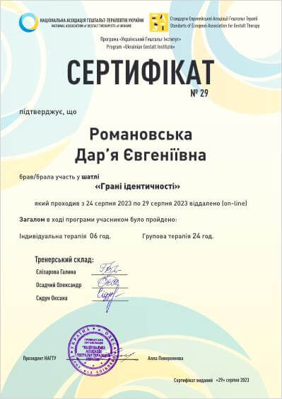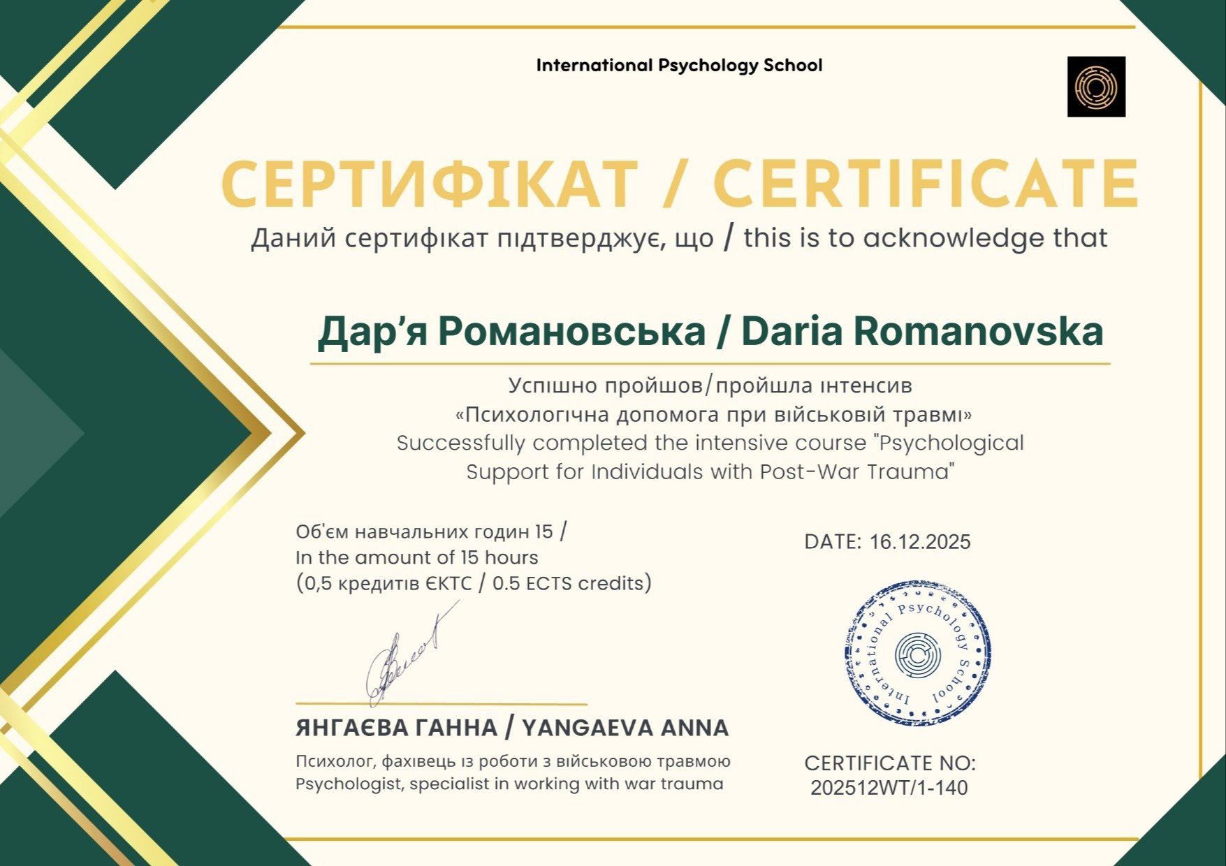 Також пройшла спеціалізацію "Гештальт терапія в роботі з гендерною ідентичністю, парами та подружніми відносинами". Проходжу спеціалізацію по роботі з емоційною залежністю (співзалежністю). Курс "Psychological First Aid" на базі Coursera.